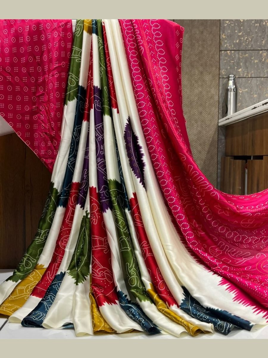 ? Product Details: Fabric: Satin Silk Print: Ajrakh Block Print Pattern: Unique Multi-Color Print Saree Length: 5.5 meters Blouse Piece: 0.8 meters (Unstitched) Occasion: Party, Festive, Traditional, Casual Wear Care: Dry clean recommended for long-lasting shine Ajrakh Printed Satin Silk Saree. Made from soft satin silk fabric, this saree comes with a stylish Ajrakh block print design in unique colors. The saree length is 5.5 meters and it includes a 0.8-meter unstitched blouse piece. Suitable for daily wear, festive occasions, weddings, and parties. The smooth satin silk fabric adds shine and comfort, making it a perfect choice for women who love traditional and stylish sarees.