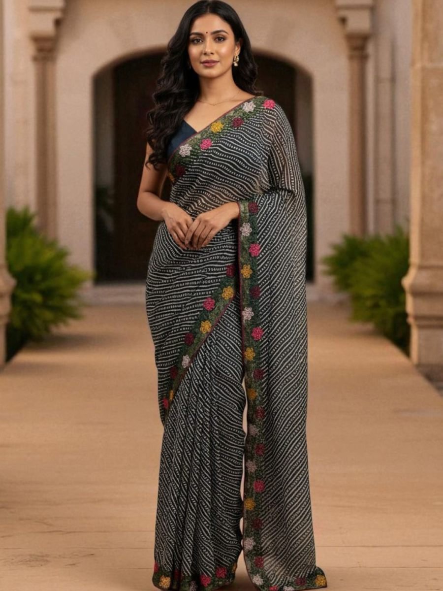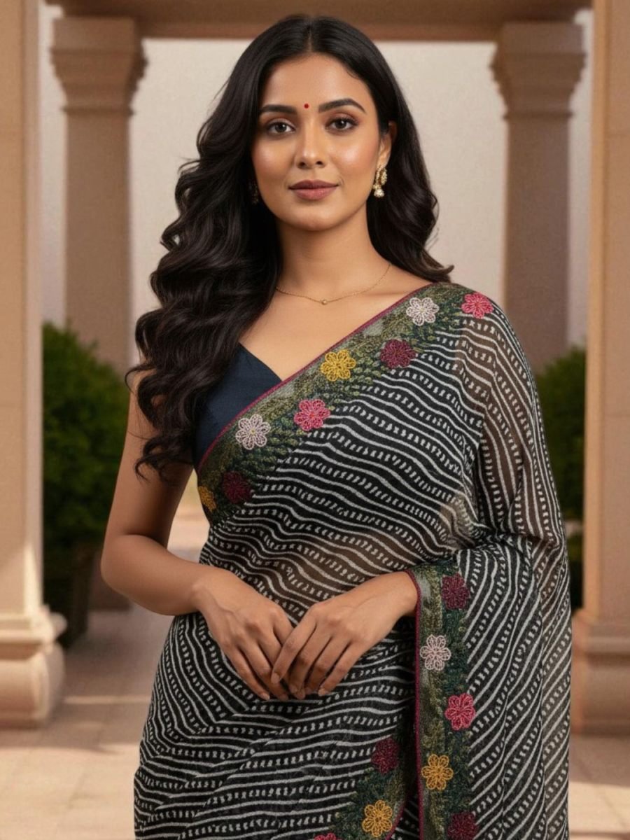 Fabric: Premium Cotton Silk with soft texture Print: Traditional Bandhani print all over saree Border: Intricate embroidered border for festive charm Blouse: Unstitched blouse piece with embroidery Comfort: Lightweight, breathable & easy to drape Occasion: Perfect for weddings, festive wear & cultural events Length: Saree – 5.5 meters | Blouse – 0.8 meters A Symphony of Fabric and Craft: The heart of this saree lies in its premium cotton silk blend, offering the best of both worlds: the breathable comfort of cotton and the subtle, elegant sheen of silk. The fabric flows beautifully, creating a flattering drape that complements every figure. Exquisite Embellishments: Framing this artistic canvas is a meticulously crafted embroidery work border. The intricate detailing on the border adds a touch of sophistication and glamour, perfectly contrasting with the traditional print. It makes the saree an instant statement piece, requiring minimal accessorizing to look complete.