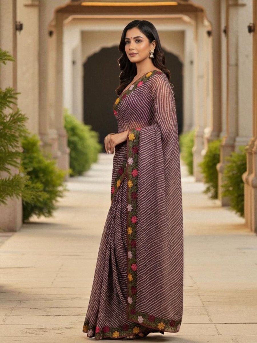 Fabric: Premium Cotton Silk with soft texture Print: Traditional Bandhani print all over saree Border: Intricate embroidered border for festive charm Blouse: Unstitched blouse piece with embroidery Comfort: Lightweight, breathable & easy to drape Occasion: Perfect for weddings, festive wear & cultural events Length: Saree – 5.5 meters | Blouse – 0.8 meters A Symphony of Fabric and Craft: The heart of this saree lies in its premium cotton silk blend, offering the best of both worlds: the breathable comfort of cotton and the subtle, elegant sheen of silk. The fabric flows beautifully, creating a flattering drape that complements every figure. Exquisite Embellishments: Framing this artistic canvas is a meticulously crafted embroidery work border. The intricate detailing on the border adds a touch of sophistication and glamour, perfectly contrasting with the traditional print. It makes the saree an instant statement piece, requiring minimal accessorizing to look complete.