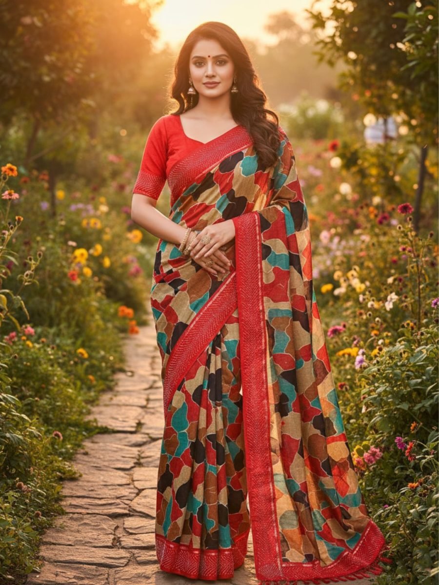 Fabric: Chiffon Work: Swarovski Diamond Work on Border Print: Abstract Printed Design Saree Length: 5.5 meters Blouse Piece: 0.8 meters (Unstitched) Occasion: Party, Festive, Wedding, Evening Wear Fit: Free Size Wash Care: Dry Clean Recommended Drape yourself in sophistication with this stunning abstract printed chiffon saree adorned with a dazzling Swarovski diamond work border. The lightweight chiffon fabric offers effortless drape and flow, making it comfortable for all-day wear. The modern abstract print blends perfectly with the shimmering Swarovski embellishments, adding a touch of glamour and luxury to your ethnic collection. Whether it’s a wedding, festive celebration, or a special evening event, this saree makes you stand out with its contemporary charm and timeless elegance. The saree comes with a 5.5-meter length and an unstitched 0.8-meter blouse piece, allowing you to style it as per your preference. Pair it with statement jewelry and heels to complete your refined ethnic look.