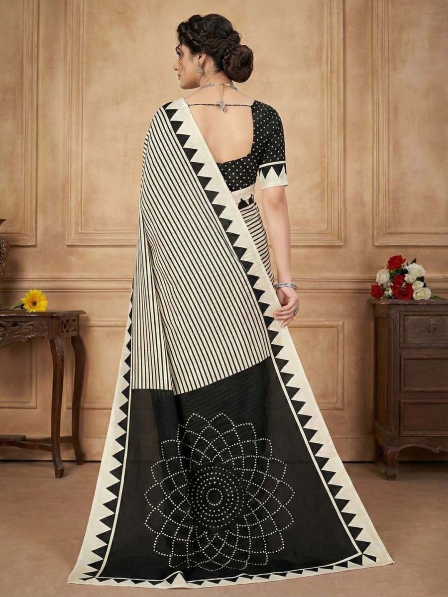 Luxurious Fabric: Made from high-quality Crepe Silk that offers a smooth texture, slight sheen, and effortless flow. Fusion Design: A unique combination of modern vertical stripes on the pleats and a traditional Bandhani-inspired print on the pallu. Statement Border: Features a distinct geometric "temple" (sawtooth) border that runs along the edges, defining the saree's shape. Lightweight ; Comfortable: The breathable nature of the fabric makes it ideal for all-day wear in any season. Matching Blouse: Comes with an unstitched blouse piece featuring a coordinating dotted print and matching border for the sleeves. Elevate your everyday style with this exquisite crepe silk saree, designed for the modern woman who loves a fusion of tradition and trend. This saree features a striking "half-and-half" concept: the body showcases bold, elongating geometric stripes for a chic, contemporary look, while the pallu displays a magnificent, large-scale Bandhani-style mandala motif that adds a touch of ethnic grandeur.