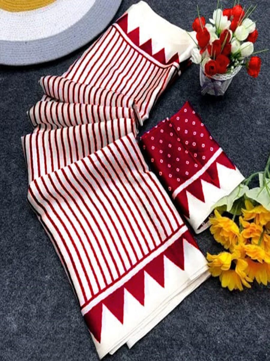 Luxurious Fabric: Made from high-quality Crepe Silk that offers a smooth texture, slight sheen, and effortless flow. Fusion Design: A unique combination of modern vertical stripes on the pleats and a traditional Bandhani-inspired print on the pallu. Statement Border: Features a distinct geometric "temple" (sawtooth) border that runs along the edges, defining the saree's shape. Lightweight ; Comfortable: The breathable nature of the fabric makes it ideal for all-day wear in any season. Matching Blouse: Comes with an unstitched blouse piece featuring a coordinating dotted print and matching border for the sleeves. Elevate your everyday style with this exquisite crepe silk saree, designed for the modern woman who loves a fusion of tradition and trend. This saree features a striking "half-and-half" concept: the body showcases bold, elongating geometric stripes for a chic, contemporary look, while the pallu displays a magnificent, large-scale Bandhani-style mandala motif that adds a touch of ethnic grandeur.
