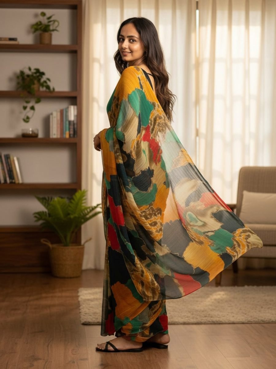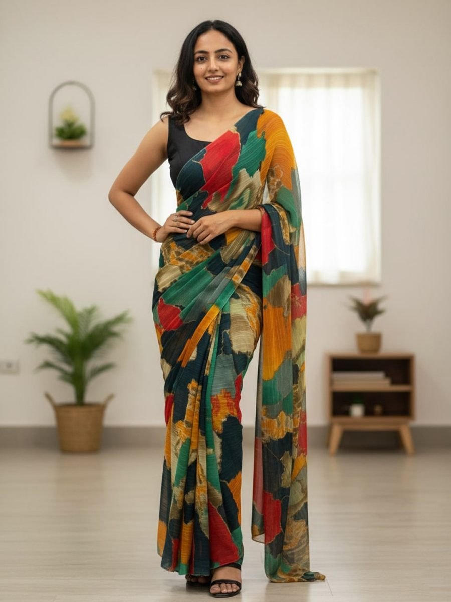 Saree Fabric: Chiffon Saree Length: 5.5 meters Blouse Fabric: Black (unstitched) Blouse Length: 0.8 meters Pattern: Multi-color abstract print Occasion: Casual wear, festive wear, party wear Description Add a splash of vibrant elegance to your wardrobe with this chiffon multi-color printed saree. Designed with a lively mix of hues, the saree offers a modern yet traditional charm. The lightweight chiffon fabric ensures a comfortable drape, making it perfect for day-long wear. Paired with a solid black blouse piece, this saree balances colorful vibrancy with timeless sophistication. Suitable for festive celebrations, family gatherings, or casual events, this saree is a must-have for effortless style.