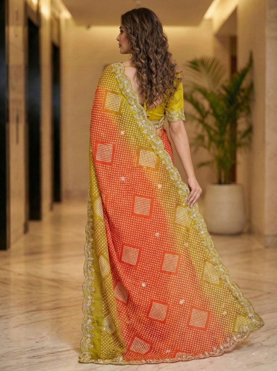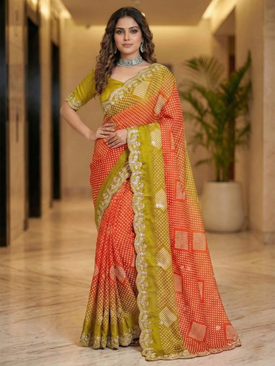Key Features Premium Fabric: Crafted from high-grade, lightweight Chiffon for a sheer, ethereal drape and a slim silhouette. Artisanal Technique: Features traditional Bandhani (tie-dye) patterns with intricate geometric square motifs. Contemporary Border: Modern scalloped cutwork edges detailed with delicate floral embroidery and Zari accents. Shaded Aesthetic: A sophisticated ombre transition that blends two tones seamlessly across the length of the fabric. Versatile Drape: The fluid nature of the Chiffon ensures easy pleating and a graceful fall, perfect for long-duration wear."