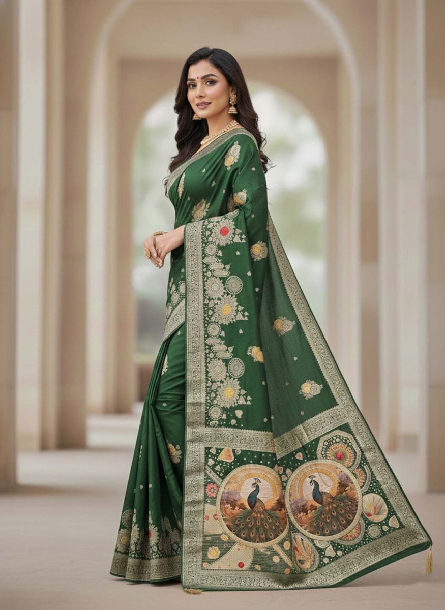 Elegant Bottle Green Dola Silk Saree with Traditional Zari Woven Peacock Pallu Latkans