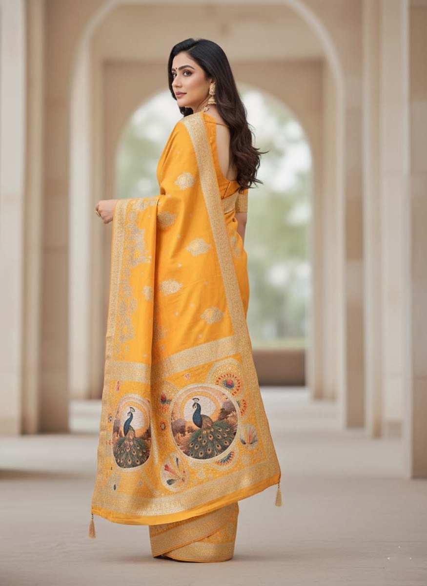 Fabric: Soft and lustrous Dola Silk for a premium feel. Workmanship: Intricate Jacquard weaving with metallic Zari and multi-color thread accents. Pallu Detail: Heavy designer Pallu featuring traditional Peacock artistry. Finishing: Elegant Latkans/Tassels attached to the Pallu edge. Occasion: Perfect for Weddings, Receptions, Festive Celebrations, and Formal Events. Step into the spotlight with this exquisite Dola Silk Saree, a masterpiece that blends traditional Indian craftsmanship with modern luxury. Crafted from premium, fluid Dola Silk, this saree offers a rich sheen and a graceful drape that suits every silhouette. The body of the saree is adorned with delicate all-over Zari butta weaving, accented by pops of threadwork. The crowning glory is the majestically woven Pallu, which features large, circular Peacock motifs—a symbol of grace and royalty. These motifs are intricately detailed, showcasing the fine artistry of the weaver.