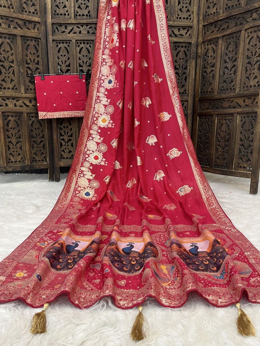 Fabric: Soft and lustrous Dola Silk for a premium feel. Workmanship: Intricate Jacquard weaving with metallic Zari and multi-color thread accents. Pallu Detail: Heavy designer Pallu featuring traditional Peacock artistry. Finishing: Elegant Latkans/Tassels attached to the Pallu edge. Occasion: Perfect for Weddings, Receptions, Festive Celebrations, and Formal Events. Step into the spotlight with this exquisite Dola Silk Saree, a masterpiece that blends traditional Indian craftsmanship with modern luxury. Crafted from premium, fluid Dola Silk, this saree offers a rich sheen and a graceful drape that suits every silhouette. The body of the saree is adorned with delicate all-over Zari butta weaving, accented by pops of threadwork. The crowning glory is the majestically woven Pallu, which features large, circular Peacock motifs—a symbol of grace and royalty. These motifs are intricately detailed, showcasing the fine artistry of the weaver.