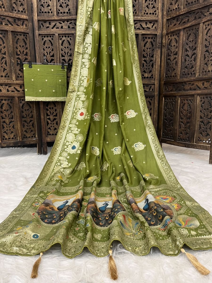 Fabric: Soft and lustrous Dola Silk for a premium feel. Workmanship: Intricate Jacquard weaving with metallic Zari and multi-color thread accents. Pallu Detail: Heavy designer Pallu featuring traditional Peacock artistry. Finishing: Elegant Latkans/Tassels attached to the Pallu edge. Occasion: Perfect for Weddings, Receptions, Festive Celebrations, and Formal Events. Step into the spotlight with this exquisite Dola Silk Saree, a masterpiece that blends traditional Indian craftsmanship with modern luxury. Crafted from premium, fluid Dola Silk, this saree offers a rich sheen and a graceful drape that suits every silhouette. The body of the saree is adorned with delicate all-over Zari butta weaving, accented by pops of threadwork. The crowning glory is the majestically woven Pallu, which features large, circular Peacock motifs—a symbol of grace and royalty. These motifs are intricately detailed, showcasing the fine artistry of the weaver.