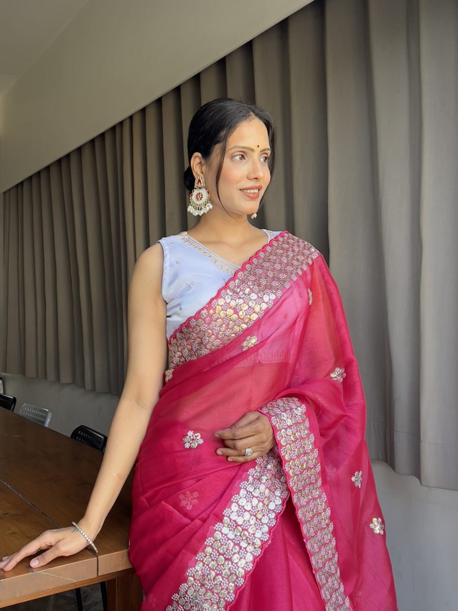 Fabric: Premium organza for a lightweight, airy feel Design: Elegant embroidered border for a luxurious look Saree Length: 5.5 meters for a full, traditional drape Blouse: Ready-made stitched blouse for instant wear Occasion: Perfect for weddings, parties, festive events & celebrations Care Instructions: Dry clean only for long-lasting beauty Drape yourself in elegance with our Organza Embroidered Border Saree with Stitched Blouse, designed for women who love the perfect blend of tradition and ready-to-wear convenience. Crafted from premium organza fabric, this saree offers a soft, lightweight, and graceful drape, making it perfect for festive occasions, weddings, and special celebrations.