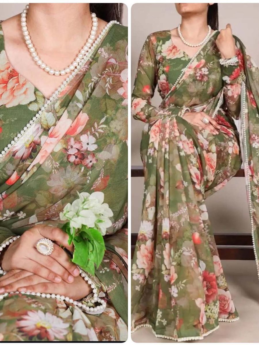 Fabric: Premium Poly-Georgette (Soft & Lightweight). Design: All-over Multi-color Floral Digital Print. Border Work: Single line Pearl/Moti Lace Border. Saree Length: 5.5 Meters. Blouse Piece: Included (0.80 Meters) – Unstitched, matching print or contrast solid color. Finish: Matte finish with a soft hand-feel. Wash Care: Dry Clean Recommended (to protect the pearl detailing). Embrace effortless elegance with this lightweight Georgette Saree, adorned with high-definition digital floral prints. Finished with a sophisticated Pearl Moti border, this drape offers a perfect fusion of modern vibrancy and classic charm, making it an ideal choice for day events, office wear, and light festivities.