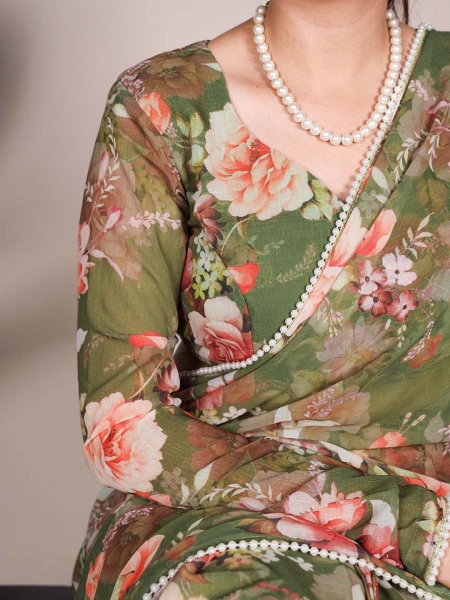 Floral Digital Print Georgette Saree with Delicate Pearl Moti Border