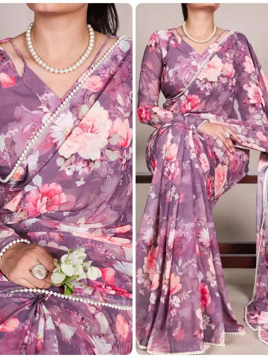 Floral Digital Print Georgette Saree with Delicate Pearl Moti Border