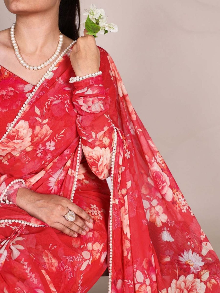 Floral Digital Print Georgette Saree with Delicate Pearl Moti Border