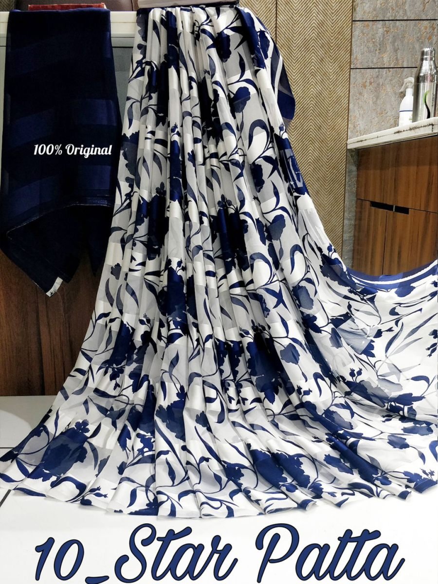 Fabric: Premium Satin Patta Georgette Design: High-definition Digital Floral Print Texture: Soft, smooth, lightweight, and easy to drape Finish: Subtle satin sheen for a luxurious look Saree Length: 5.5 Meters Blouse: Includes 0.8-meter unstitched matching blouse piece Occasion: Perfect for Party Wear, Festive Occasions, Casual Outings, and Evening Events Care Instructions: Gentle hand wash or dry clean recommended for longevity Satin Patta Georgette Saree. This beautiful piece is a celebration of classic floral charm on a contemporary fabric. The saree is crafted from premium satin patta georgette, a material renowned for its feather-light feel, subtle sheen, and incredibly fluid drape that gracefully accentuates your silhouette. Embrace effortless elegance with this stunning georgette saree, adorned with a vibrant floral print. The lightweight fabric drapes beautifully, while the shimmering satin patta (border) adds a touch of sophisticated glamour. Perfect for both casual outings and festive occasions.