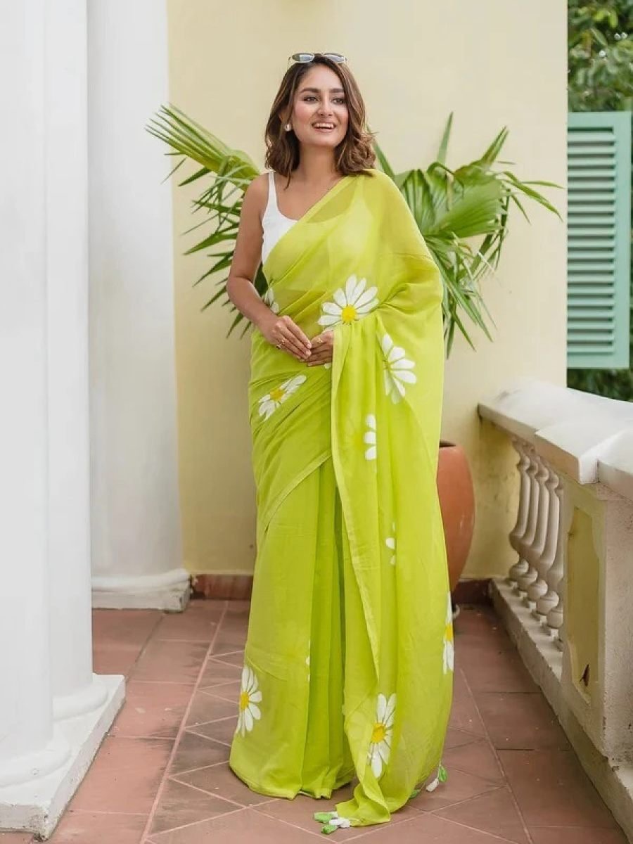 Fabric: Pure Cotton Handloom Design: Floral Print Saree Length: 5.5 meters Blouse Piece: 0.8 meters (Unstitched) Lightweight, breathable & skin-friendly Ideal for festive wear, office wear, and casual occasions Easy to drape & comfortable for all-day wear The saree comes with a 5.5 meter length for graceful draping and includes an unstitched blouse piece of 0.8 meters, giving you the freedom to style it as per your choice. Pure cotton fabric adds a natural shine, easy drape, and superior comfort, making this saree a must-have in your ethnic wardrobe. Pair it with traditional jewelry and elegant footwear to complete the look.