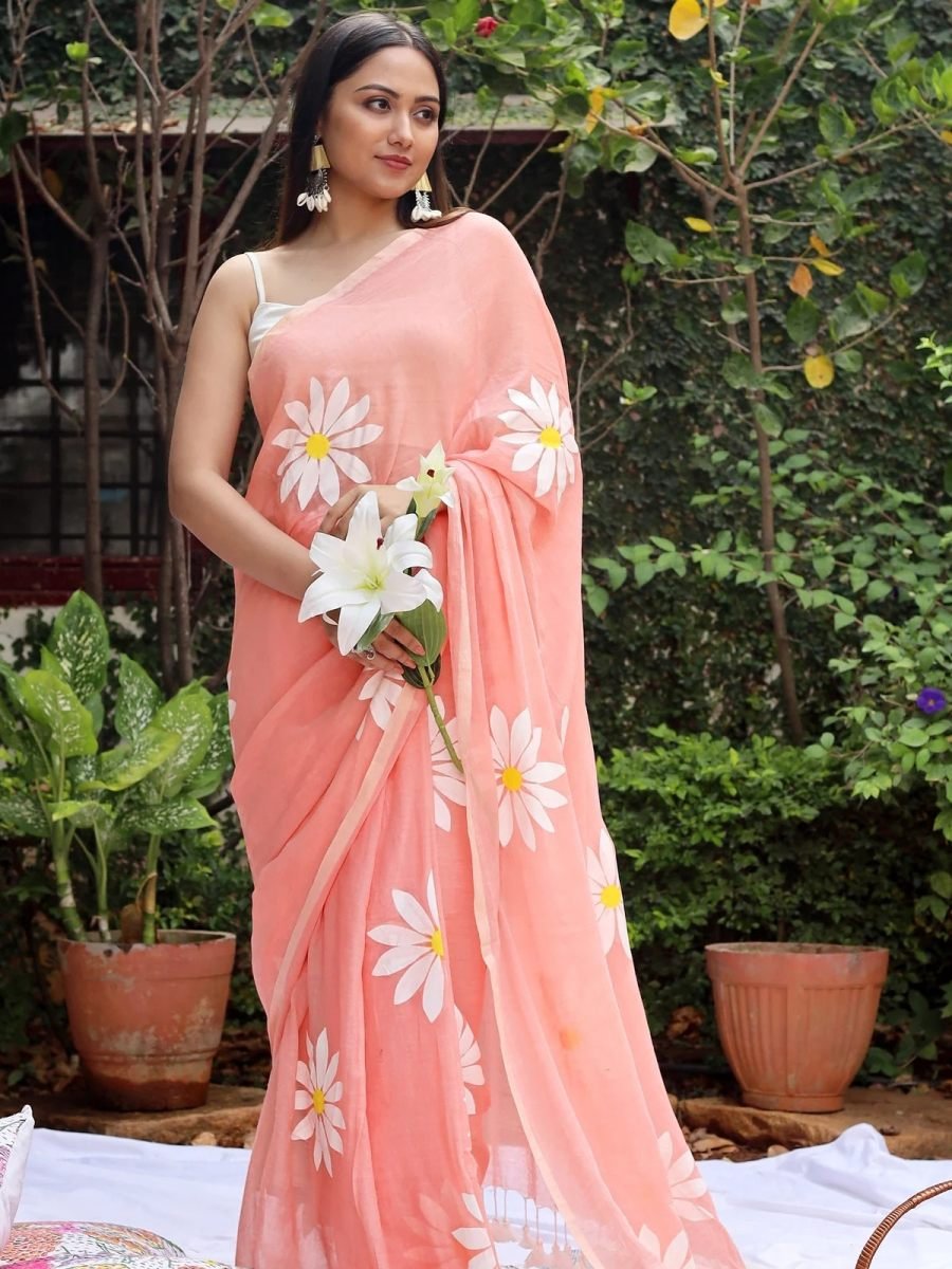 Fabric: Pure Cotton Handloom Design: Floral Print Saree Length: 5.5 meters Blouse Piece: 0.8 meters (Unstitched) Lightweight, breathable & skin-friendly Ideal for festive wear, office wear, and casual occasions Easy to drape & comfortable for all-day wear The saree comes with a 5.5 meter length for graceful draping and includes an unstitched blouse piece of 0.8 meters, giving you the freedom to style it as per your choice. Pure cotton fabric adds a natural shine, easy drape, and superior comfort, making this saree a must-have in your ethnic wardrobe. Pair it with traditional jewelry and elegant footwear to complete the look.