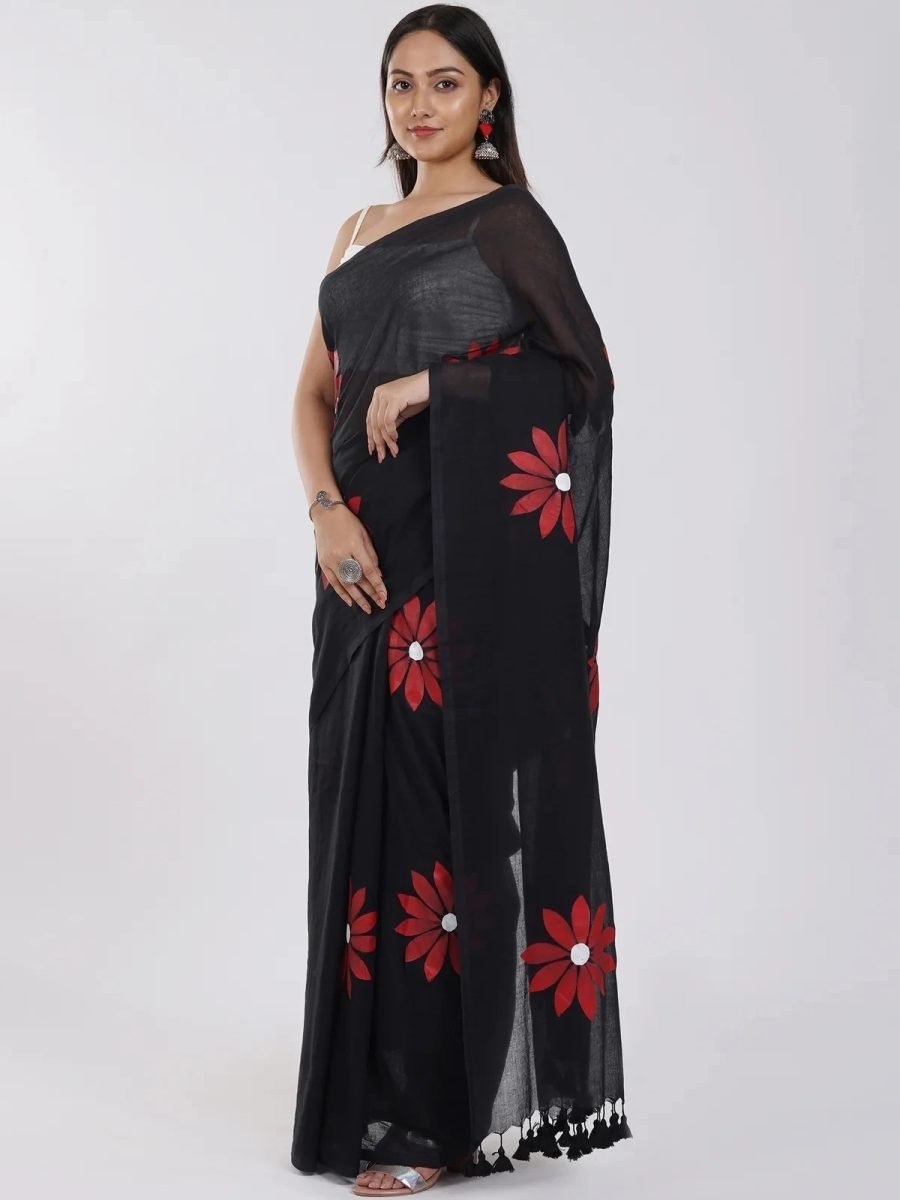 Fabric: Pure Cotton Handloom Design: Floral Print Saree Length: 5.5 meters Blouse Piece: 0.8 meters (Unstitched) Lightweight, breathable & skin-friendly Ideal for festive wear, office wear, and casual occasions Easy to drape & comfortable for all-day wear The saree comes with a 5.5 meter length for graceful draping and includes an unstitched blouse piece of 0.8 meters, giving you the freedom to style it as per your choice. Pure cotton fabric adds a natural shine, easy drape, and superior comfort, making this saree a must-have in your ethnic wardrobe. Pair it with traditional jewelry and elegant footwear to complete the look.