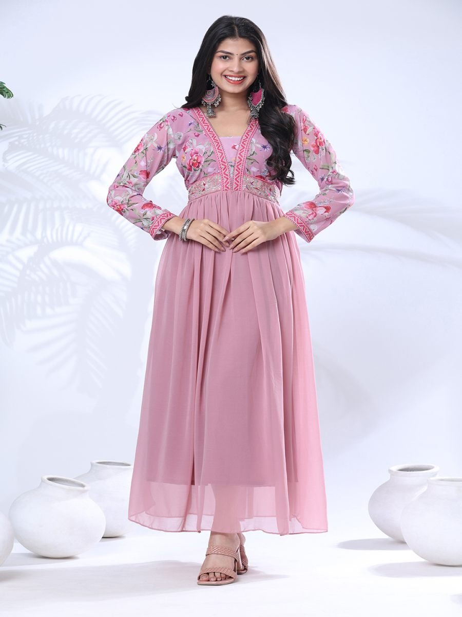 Georgette Embroidery Flared Pink Gown