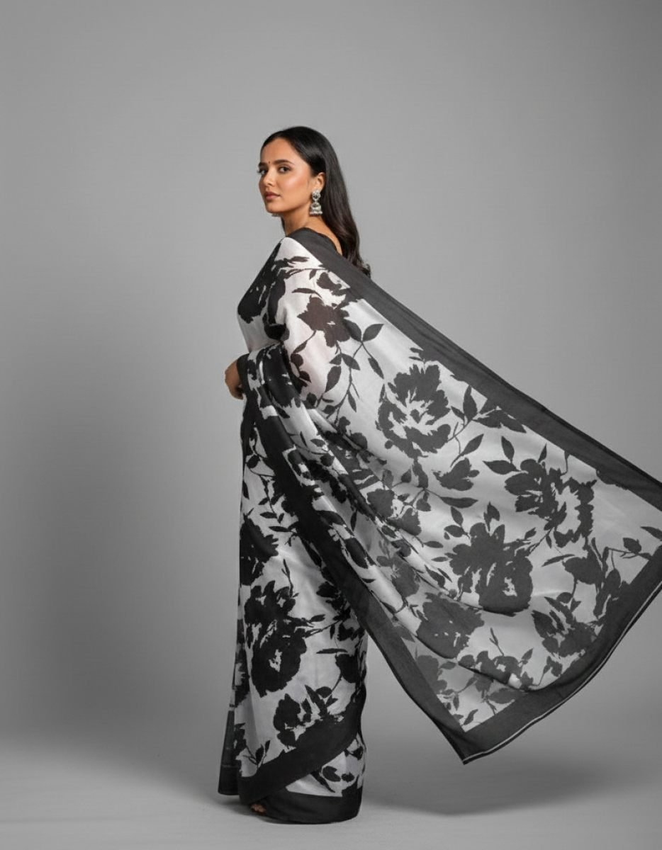 Premium Fabric: Made from high-quality Japan Satin Silk for a smooth, lustrous, and wrinkle-resistant finish. Graphic Design: Features a bold, digital "Optical Illusion" swirl print that adds a modern edge to traditional attire. Bold Digital Print: Features a sharp, high-definition monochromatic leaf pattern that won't fade over time. Sleek Border: Finished with a 1-inch solid black patti (border) for a clean and structured look. Easy to Drape: The soft, lightweight material ensures easy pleating and a comfortable carry for long hours. Versatile Styling: Perfectly pairs with a sleeveless black blouse and statement pearls or silver jewelry. Occasion: Ideal for cocktail parties, farewells, evening events, and fashion-forward gatherings. Description Black and White Leaf Print Saree. Crafted from high-quality Modal Satin Silk, this saree offers a buttery-smooth texture and a luxurious, liquid-like drape that contours perfectly to the body. The design features a high-contrast, oversized botanical print that merges traditional nature motifs with a modern, minimalist aesthetic. Whether it's a daytime formal event or an evening cocktail party, this saree ensures a standout look with its subtle sheen and artistic flair. Monochrome Graphic Print Satin Saree, a perfect blend of retro charm and contemporary high fashion. This saree features a mesmerizing, hypnotic swirl pattern in a high-contrast black and white palette, designed to create a striking visual impact.