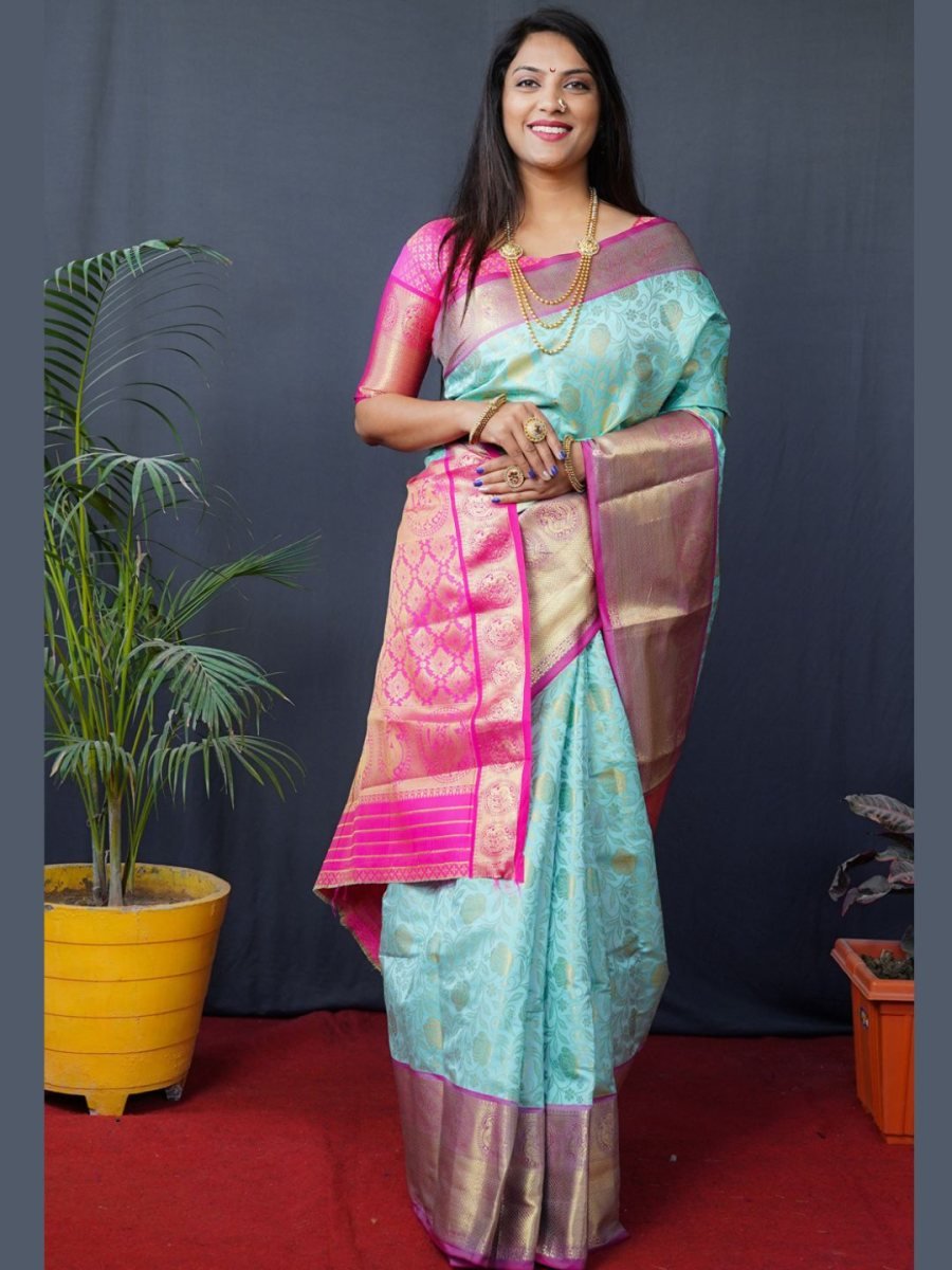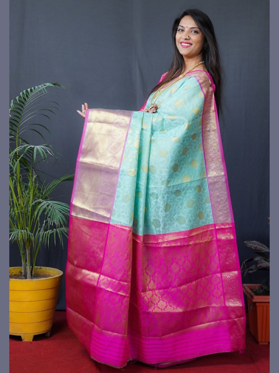 Fabric: Premium Kanjivaram Silk Design: Rich woven pallu with traditional patterns Saree Length: 5.5 meters Blouse Length: 0.8 meters (Unstitched) Occasion: Wedding, Party, Festive, Traditional, Cultural Events Style: Classic Indian Ethnic Wear Care Instructions: Dry clean recommended for longevity The saree comes with a 5.5-meter length ensuring a perfect drape, and an 0.8-meter unstitched blouse piece for a customized fit. Designed to reflect sophistication, the rich woven pallu enhances the overall grandeur, while the smooth silk body ensures comfort throughout the day.
