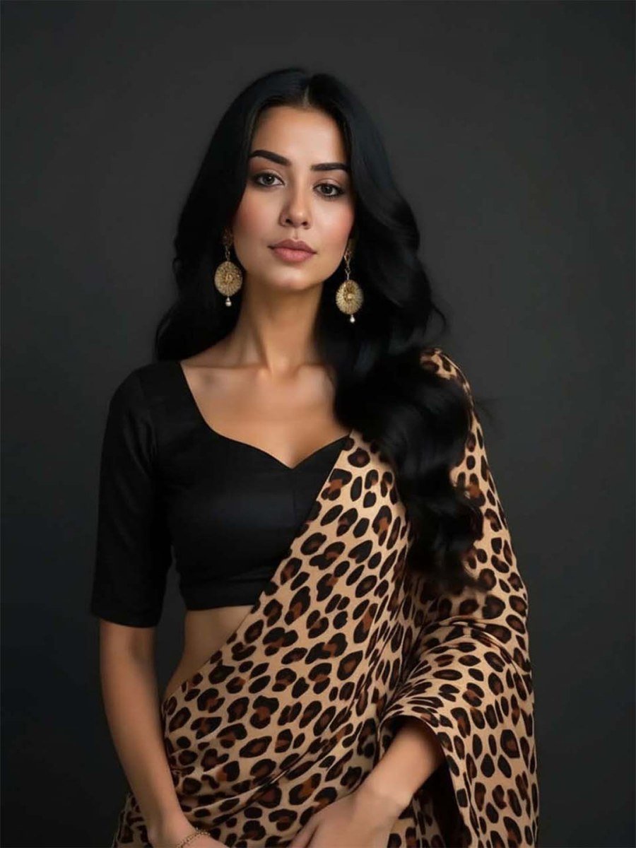 Leopard Print Silk Crepe Saree with Contrast Black Blouse Piece
