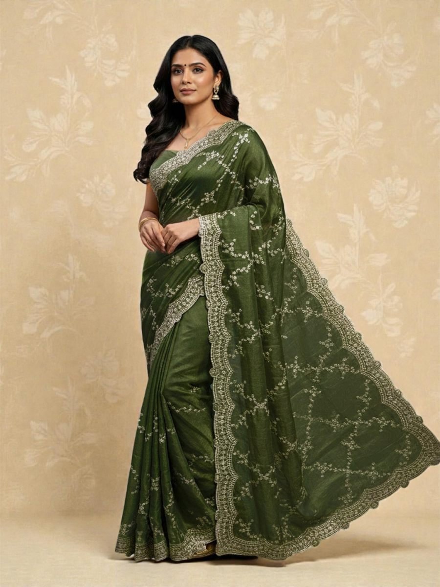 Key Features Premium Fabric Fusion: Made from a luxurious blend of lightweight chiffon and glossy satin silk, delivering a smooth texture, graceful flow, and elegant sheen. All-Over Lehriya Sequin Pattern: Features a continuous Lehriya-inspired design enhanced with fine sequin work, adding a subtle shimmer and rich visual depth throughout the saree. Designer Scalloped Cut-Work Border: Highlighted with a finely crafted scalloped border adorned with heavy floral embroidery and sequin detailing for a regal and festive finish. Unstitched Matching Blouse Piece: Comes with a coordinated unstitched blouse fabric, offering flexibility to customize neckline, sleeve length, and fitting as per personal style. Lightweight & Elegant Drape: Soft and airy fabric ensures easy pleating, comfortable wear, and a flattering silhouette suitable for all body types.