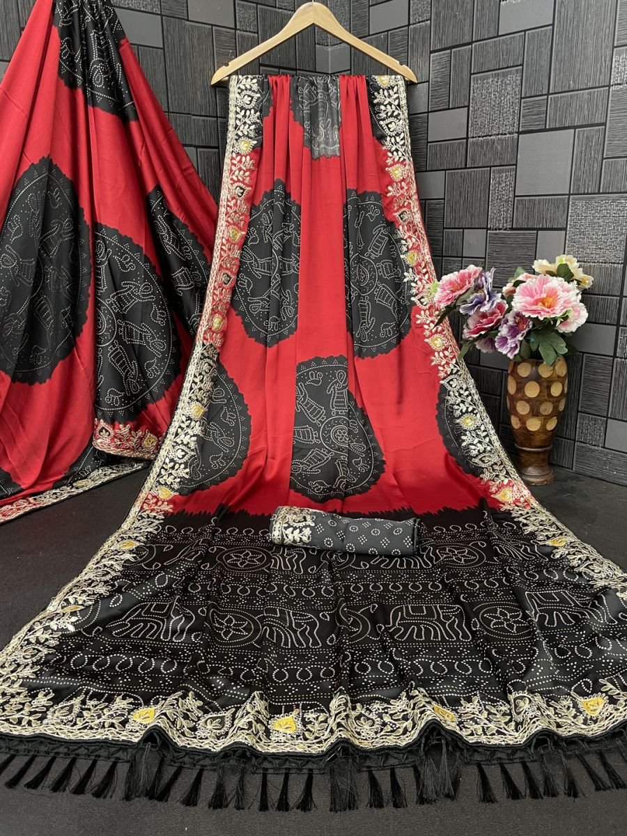Premium Satin Silk Celebration Saree Intricate Embroidery Bandhani Moti