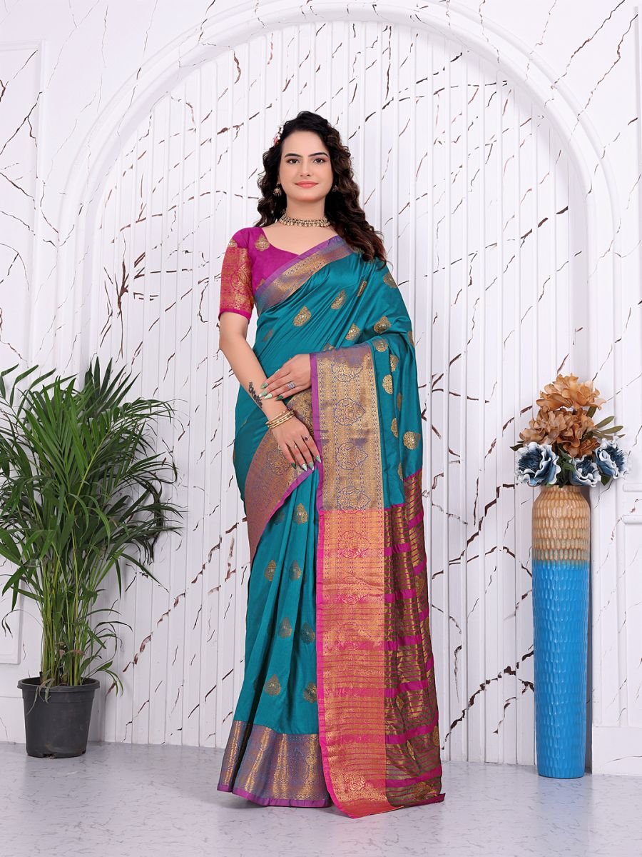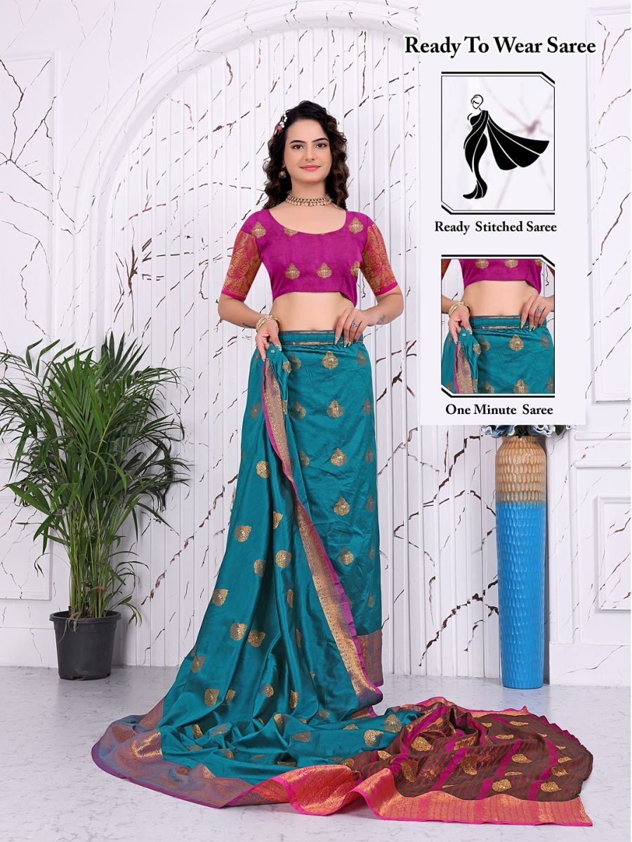 Fabric: 100% Pure Banarasi Silk, offering a premium shine, soft texture, and durable quality. Workmanship: Features intricate Jacquard weaving and traditional woven motifs throughout the body and pallu. Style: Ready-to-wear/one-minute saree concept with pre-sewn pleats for a hassle-free experience. Fit & Comfort: Designed with a convenient waist closure system (hooks/elastic) to ensure a secure and comfortable fit for various waist sizes. Blouse: Includes a coordinating unstitched blouse piece with matching woven borders. Occasion: Perfect for weddings, receptions, festivals, and cultural events. Care Instructions: Professional dry clean only to maintain the integrity of the silk and weaving. Ready-to-Wear Banarasi Silk Saree. Crafted for the modern woman who cherishes heritage but values time, this saree eliminates the hassle of pleating and draping. Made from Pure Banarasi Silk, the fabric offers a lustrous sheen and a fluid drape that feels regal against the skin. The body of the saree is adorned with sophisticated Jacquard and woven weaving work, creating a rich texture and an opulent aesthetic suitable for the grandest occasions.