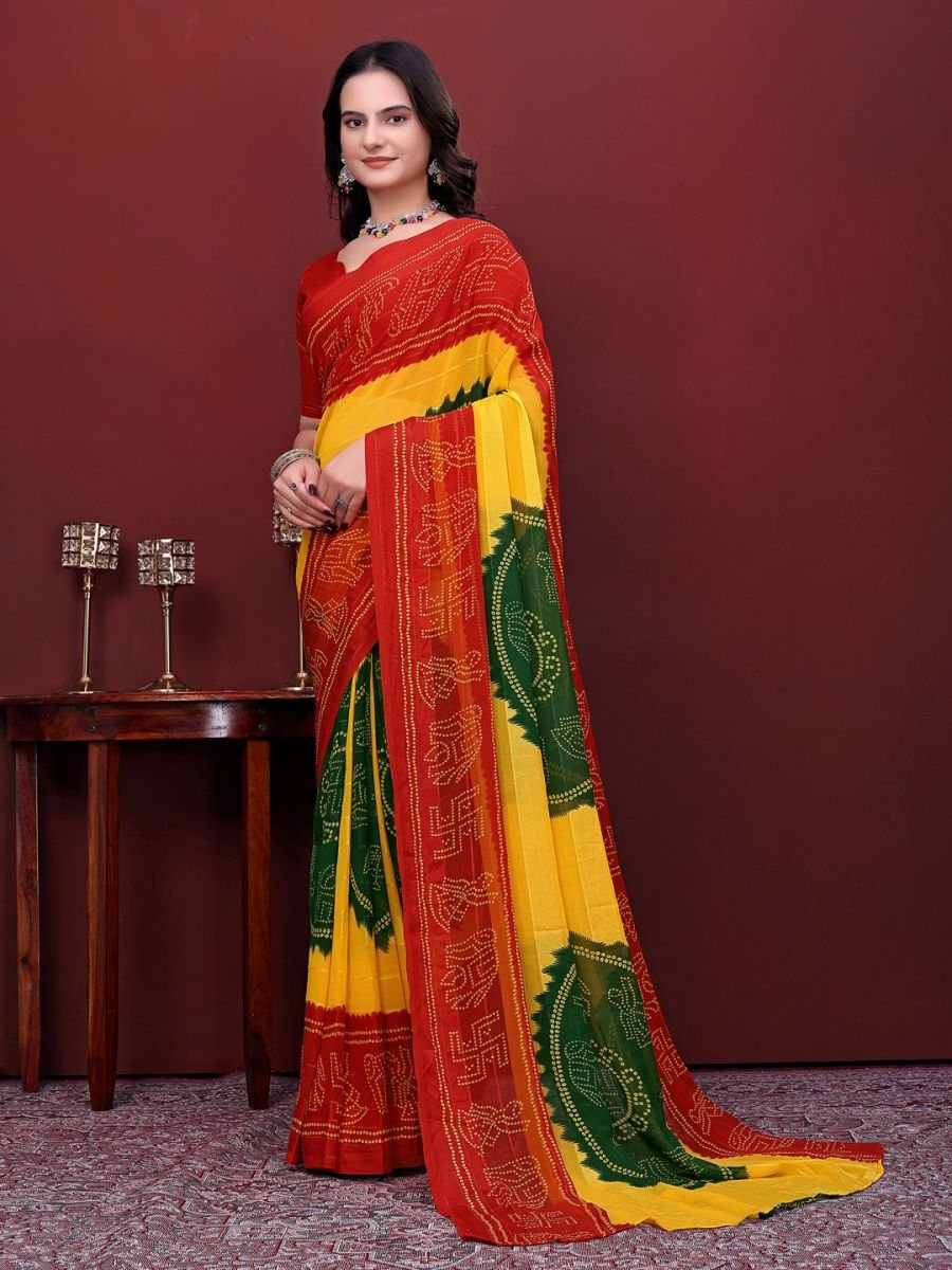 Product Highlights (Key Features) Ready-to-Wear Convenience: Features pre-stitched pleats. Just wrap it like a skirt and secure the waist—no safety pins or tucking required! Universal Adjustable Fit: The innovative waistband expands from 26" to 54" inches, making it a "Free Size" solution for all waist sizes. Premium Simmer Fabric: A lightweight silk-blend fabric that offers a soft feel and a subtle metallic shimmer for a luxurious look. Standard Dimensions: Saree Height (width) is 39 inches, providing a graceful floor-length silhouette. Traditional Bandhani Design: Vibrant tri-color pattern with intricate ethnic motifs, perfect for Haldi, Mehndi, or Festive celebrations. Unstitched Blouse Piece: Comes with a matching unstitched blouse fabric that you can stitch to your preferred style and fit. Easy Maintenance: Lightweight and wrinkle-resistant, making it comfortable for long-duration wear.