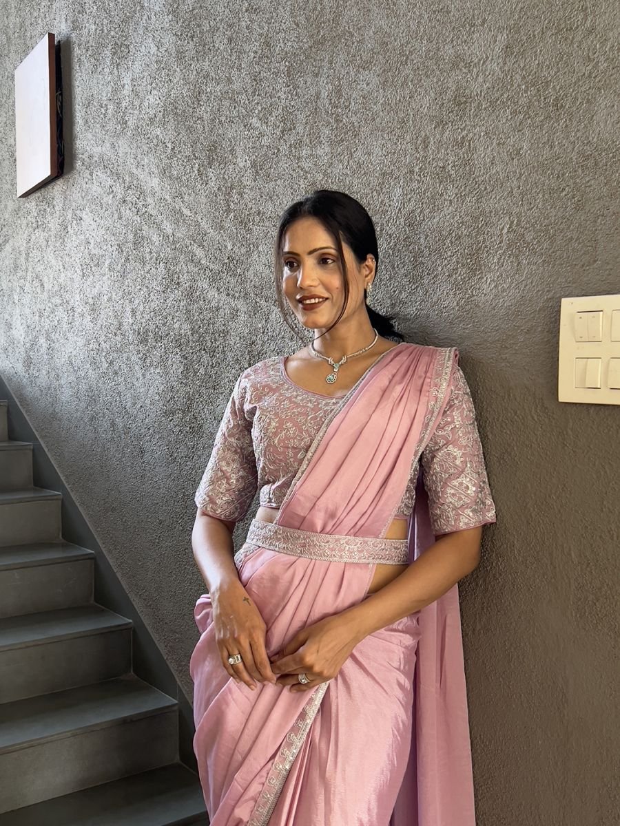 Ready To Wear Chinon Embroidery Work Saree With Stitched Blouse