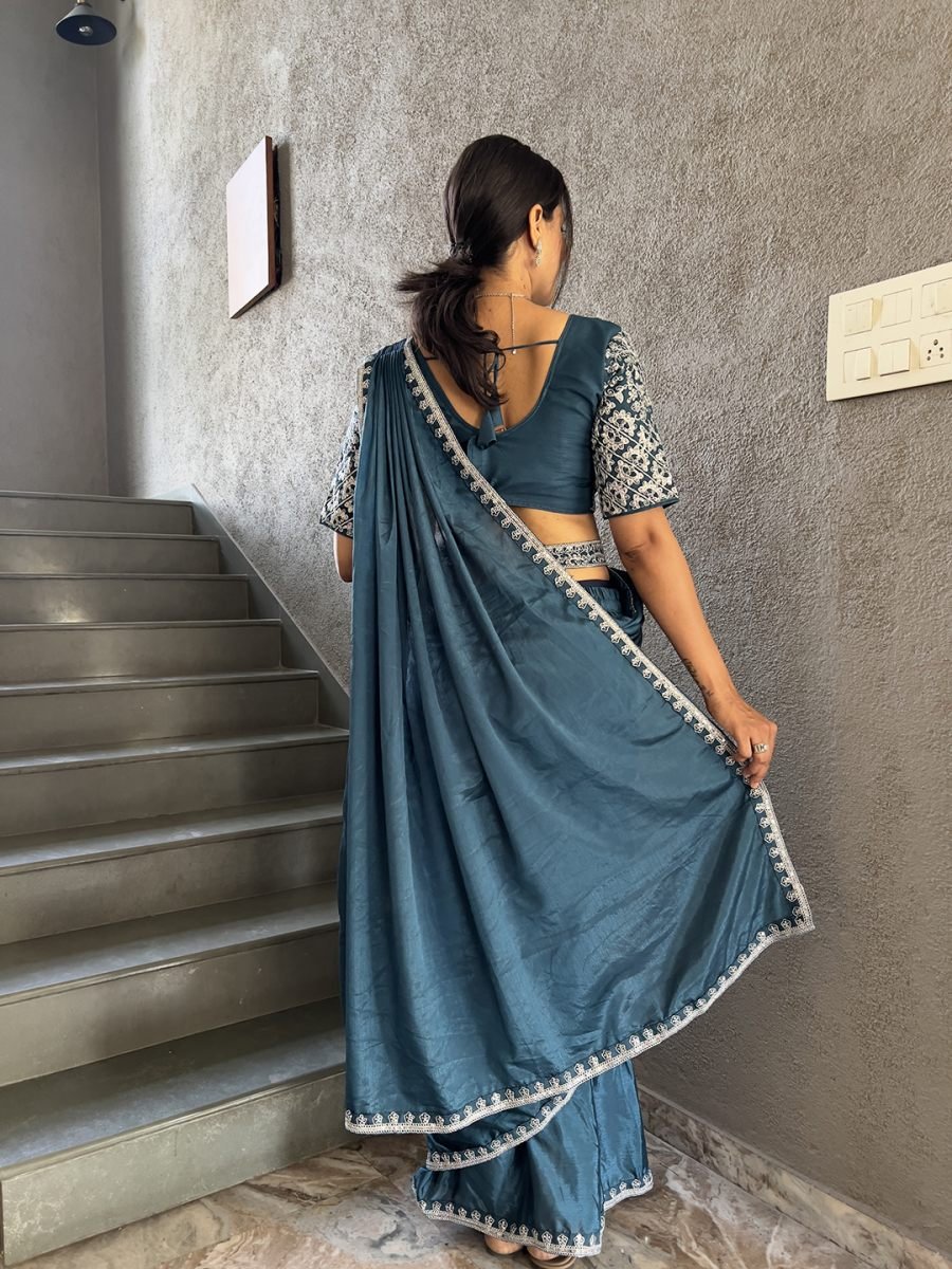 * Fabric: Heavy Chinon * Design: Embroidery Sequence Cording Work (Ready To Wear) * Blouse Fabric: Heavy Chinon * Blouse Size: Full Stitched ( 38 up to 42) * Product Description: With its elaborate embroidery cording work that gives a touch of sophistication and elegance, this gorgeous saree is made from opulent heavy Chinon fabric. The saree's ready-to-wear style makes it effortless and appropriate for any setting. The shirt that goes with it has the same beautiful embroidered and cording work and is made of high-quality Banglori fabric. Given that it is unstitched, you can alter the fit to suit your preferences. The blouse fits a variety of body shapes because it is available in free sizing. This elegantly designed and finely made saree is ideal for weddings, parties, or other special events, and it will turn heads wherever you go.