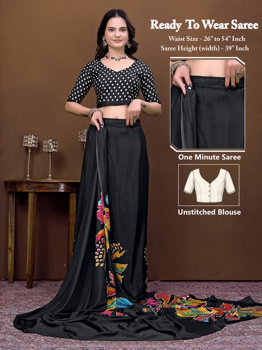 Key Features: • Fabric: Premium Silk Crepe Saree • Design: Artistic Batik Floral Print on Pallu • Style: Ready To Wear / One Minute Saree • Blouse: Polka Dot Printed Unstitched Blouse Piece • Waist Size: Adjustable from 26" to 54" Inch • Saree Height (Width): 39 Inch • Comfort Fit: Pre-stitched pleats for easy draping • Occasion: Festive, Party Wear, Wedding Functions, Ethnic Events • Lightweight & Flowing Fabric: Comfortable for long wear Product Description: Ready To Wear Silk Crepe Saree designed for effortless style and comfort. This one-minute saree features a smooth and flowy silk crepe fabric that drapes beautifully and gives a graceful silhouette. The saree showcases vibrant batik floral prints on the pallu, adding a modern artistic touch to the classic saree look. It comes with a stylish polka dot patterned blouse piece (unstitched) that perfectly complements the saree design. The pre-stitched pleats make it extremely easy to wear, making it ideal for parties, festive occasions, and special gatherings. With its adjustable waist design, this saree ensures a comfortable fit while maintaining a chic and fashionable appearance.