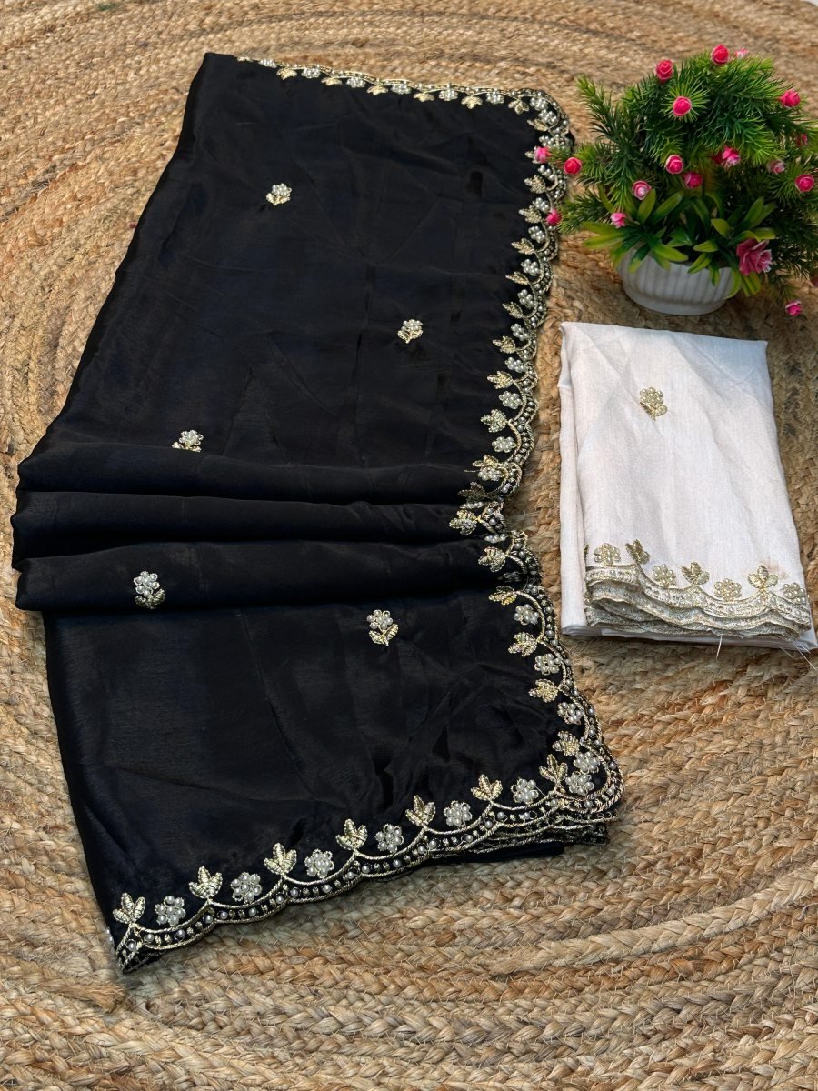 Silk Chinon Embroidered Saree with Thread Moti Work Unstitched Blouse Piece Elegant Designer Saree
