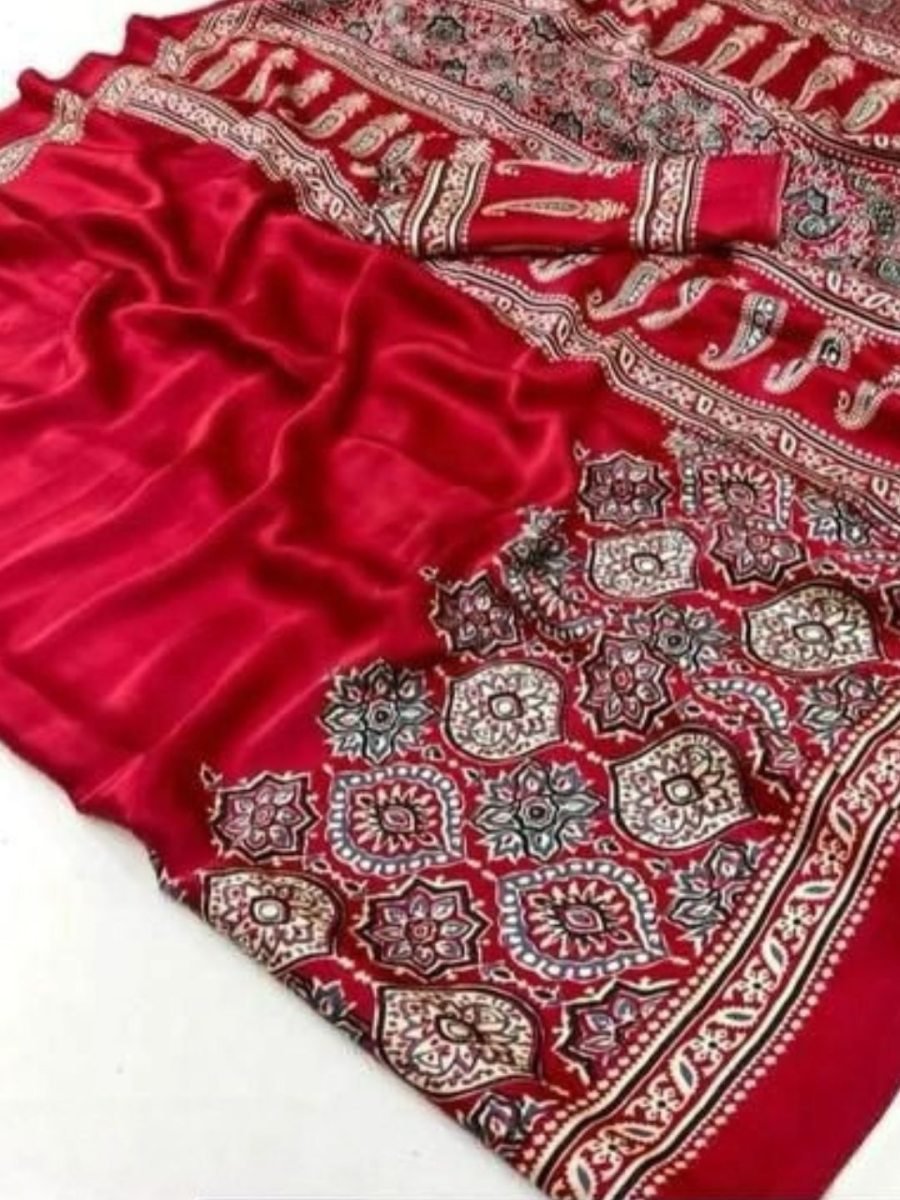 Fabric: Soft Modal Silk – lightweight, breathable, and lustrous | Design: Traditional Ajrakh print with intricate motifs | Saree Length: 5.5 meters | Blouse Piece: 0.8 meters unstitched | Style: Perfect for weddings, festivals, parties, or casual elegance | Care Instructions: Dry clean recommended for lasting beauty. | Elevate your ethnic wardrobe with this exquisite Soft Modal Silk Ajrakh Printed Saree, a perfect blend of tradition, artistry, and comfort. Crafted from premium modal silk, this saree offers a luxuriously soft, smooth texture with a natural sheen that drapes beautifully on any body type.