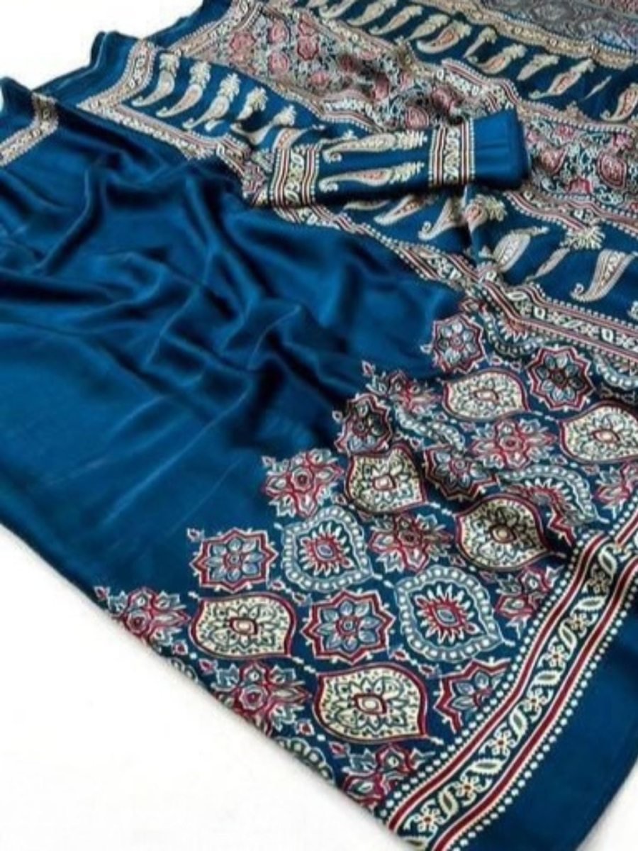 Fabric: Soft Modal Silk – lightweight, breathable, and lustrous | Design: Traditional Ajrakh print with intricate motifs | Saree Length: 5.5 meters | Blouse Piece: 0.8 meters unstitched | Style: Perfect for weddings, festivals, parties, or casual elegance | Care Instructions: Dry clean recommended for lasting beauty. | Elevate your ethnic wardrobe with this exquisite Soft Modal Silk Ajrakh Printed Saree, a perfect blend of tradition, artistry, and comfort. Crafted from premium modal silk, this saree offers a luxuriously soft, smooth texture with a natural sheen that drapes beautifully on any body type.