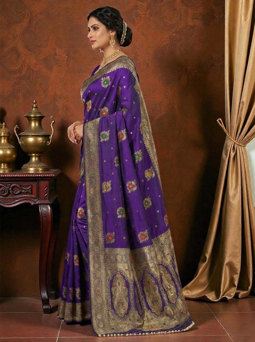 Fabric: Authentic Dola Silk (Soft and Lustrous). Work Type: Full Zari Weaving with Multi-thread Accents. Design: Floral Buttis and Architectural Paisley Pallu. Border: Broad Zari Border with Intricate Weaving. Special Feature: Designer Bead Latkans/Tassels on Pallu. Blouse: Includes matching Dola Silk unstitched blouse piece with woven border. Indulge in the luxurious feel of our Premium Dola Silk Saree, a garment designed for the woman who appreciates the finer details of Indian heritage. The fabric offers a soft, fluid drape with a subtle natural sheen that enhances the intricate Jacquard weaving throughout the piece. Exquisite Craftsmanship: The saree features an all-over pattern of woven floral buttis, accented with multi-colored threadwork that mimics the classic Meenakari art form. The borders are framed with a thick Zari weave, showcasing traditional vine and leaf patterns that add a structural elegance to the drape.