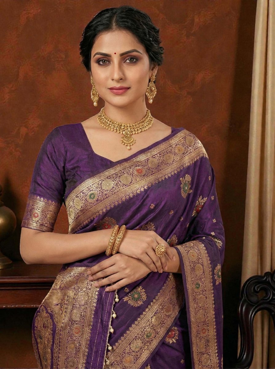 Fabric: Authentic Dola Silk (Soft and Lustrous). Work Type: Full Zari Weaving with Multi-thread Accents. Design: Floral Buttis and Architectural Paisley Pallu. Border: Broad Zari Border with Intricate Weaving. Special Feature: Designer Bead Latkans/Tassels on Pallu. Blouse: Includes matching Dola Silk unstitched blouse piece with woven border. Indulge in the luxurious feel of our Premium Dola Silk Saree, a garment designed for the woman who appreciates the finer details of Indian heritage. The fabric offers a soft, fluid drape with a subtle natural sheen that enhances the intricate Jacquard weaving throughout the piece. Exquisite Craftsmanship: The saree features an all-over pattern of woven floral buttis, accented with multi-colored threadwork that mimics the classic Meenakari art form. The borders are framed with a thick Zari weave, showcasing traditional vine and leaf patterns that add a structural elegance to the drape.