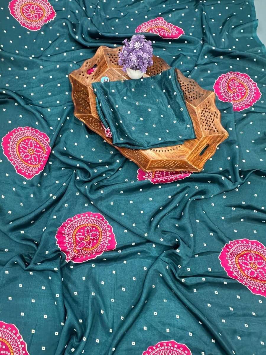 Saree Fabric: Chinnon Blouse: Attached Blouse Piece Blouse Fabric: Chinnon Pattern: Bandhani (Tie-Dye) Print Saree Length: 5.5 Meters Blouse Length: 0.8 Meters Net Quantity (N): 1 Saree with Blouse Piece Type: Party Wear, Festive Wear, Wedding Wear Country of Origin: India ? Premium Fabric: Made from high-quality Chinnon, it's light, airy, and easy to manage, ensuring you stay comfortable through long hours of celebration. ? Timeless Design: The iconic Bandhani print is always in style, making this a valuable addition to your ethnic wardrobe. ? Party Perfect: Whether it's a wedding, a festival like Diwali, a reception, or a family get-together, this saree ensures you look your absolute best. ? Complete Look: It comes with a matching blouse piece, allowing you to get it stitched to your exact style and fit. The classic Bandhani (or Badhani) print, a celebrated tie-dye technique from Rajasthan, brings a burst of vibrant color and festive energy. Printed on premium Chinnon fabric, this saree feels incredibly soft and lightweight and has a graceful, flowing drape that flatters every figure.