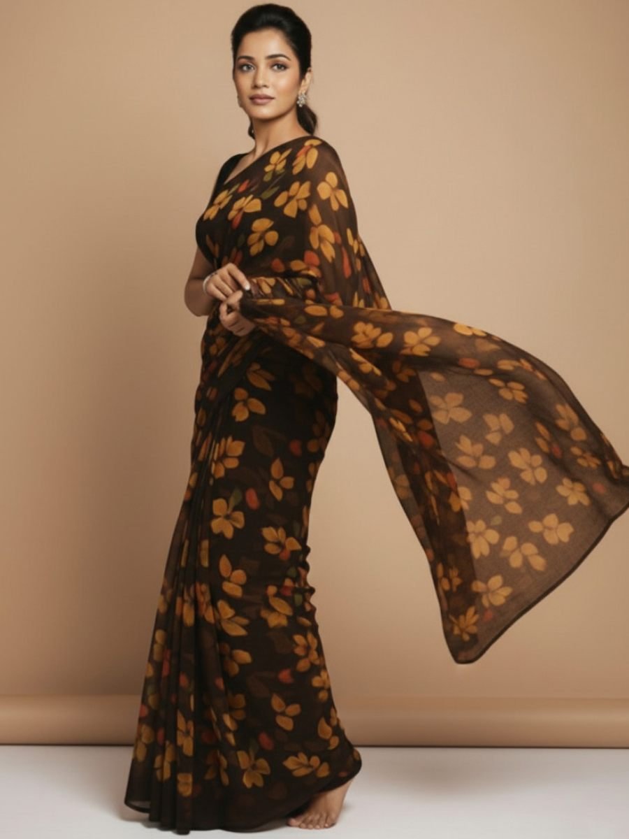 Fabric: Premium Georgette Work/Print: Digital All-Over Floral Print Type: Ready to Wear (Pre-stitched Saree) Saree Length: 5.5 Meters Waist Size: Adjustable with hooks, fits up to waist size 42 Blouse: Unstitched Blouse Piece Blouse Fabric: Matching Georgette Blouse Length: 0.8 Meters Care Instructions: Gentle hand wash or dry clean for best results. Package Contains: 1 Ready-to-Wear Saree, 1 Unstitched Blouse Piece The Convenience of Ready-to-Wear: Say goodbye to the hassle of pleating! Our ready-to-wear saree is expertly pre-stitched, allowing you to slip it on in under a minute. It features an adjustable waistband for a comfortable and secure fit, giving you a perfect drape every single time without any effort. It’s the ideal solution for beginners or anyone looking for a quick and glamorous ethnic look.Embrace the perfect fusion of traditional charm and contemporary convenience with our All-Over Floral Print Georgette Ready-to-Wear Saree. Designed for the modern woman who values both style and time, this saree is a wardrobe essential.