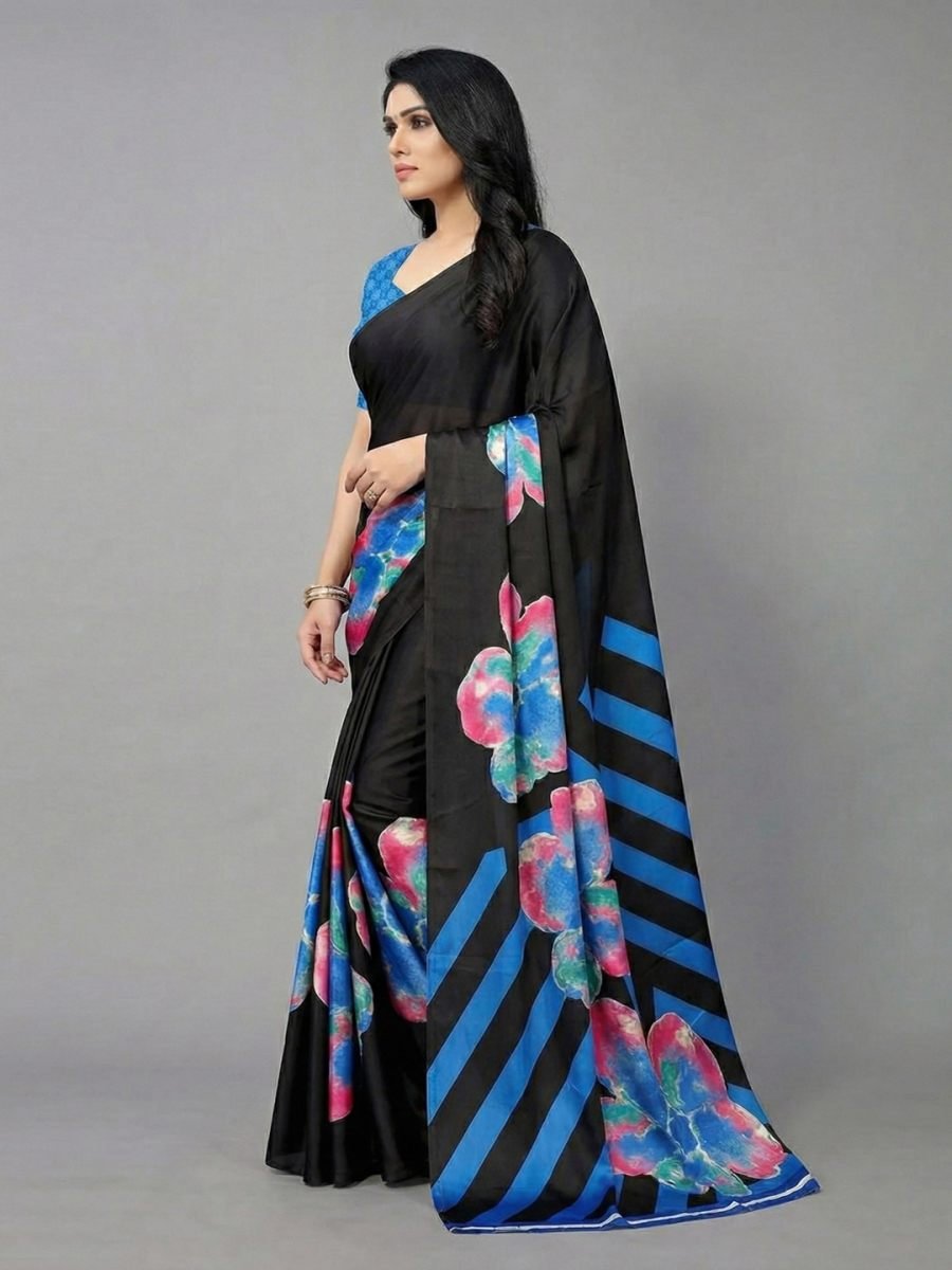 Detailed Product Description Elevate your style quotient with this stunning Satin Silk Saree, designed for the modern woman who loves a blend of tradition and trend. Crafted from premium quality satin silk, this saree boasts a glossy texture and a butter-soft feel against the skin, ensuring maximum comfort throughout the day. The highlight of this drape is its exquisite Digital Print, featuring a unique fusion of artistic floral motifs on the body and bold, diagonal geometric stripes on the pallu. This contrast creates a striking visual appeal that is perfect for any occasion. Whether you are heading to a kitty party, a corporate event, or a casual dinner, the lightweight and flowy nature of the fabric ensures a flattering silhouette and easy draping. The saree comes paired with a contrasting unstitched blouse piece that can be styled to your preference. Add this versatile masterpiece to your wardrobe and make heads turn wherever you go.