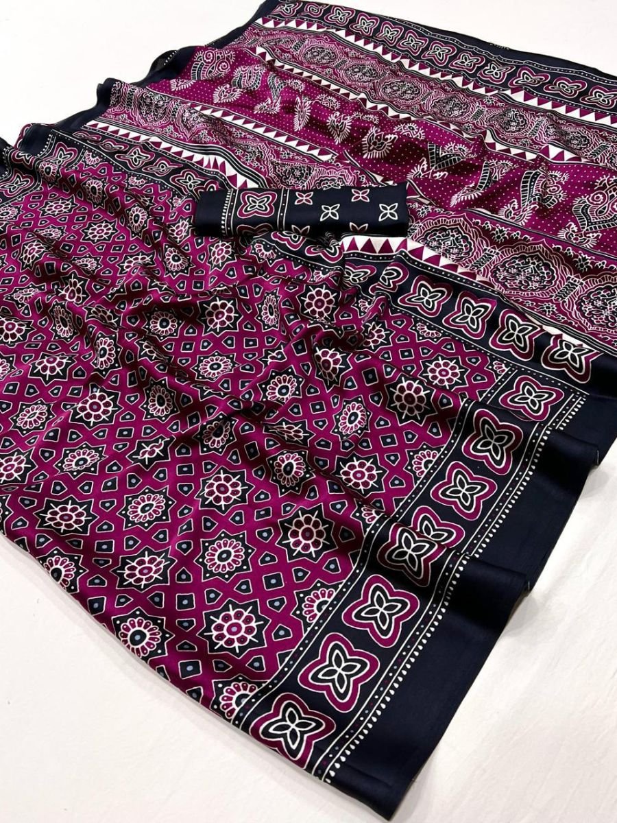 Fabric: Soft Modal Silk – lightweight, breathable, and lustrous | Design: Traditional Ajrakh print with intricate motifs | Saree Length: 5.5 meters | Blouse Piece: 0.8 meters unstitched | Style: Perfect for weddings, festivals, parties, or casual elegance | Care Instructions: Dry clean recommended for lasting beauty. | Elevate your ethnic wardrobe with this exquisite Soft Modal Silk Ajrakh Printed Saree, a perfect blend of tradition, artistry, and comfort. Crafted from premium modal silk, this saree offers a luxuriously soft, smooth texture with a natural sheen that drapes beautifully on any body type.