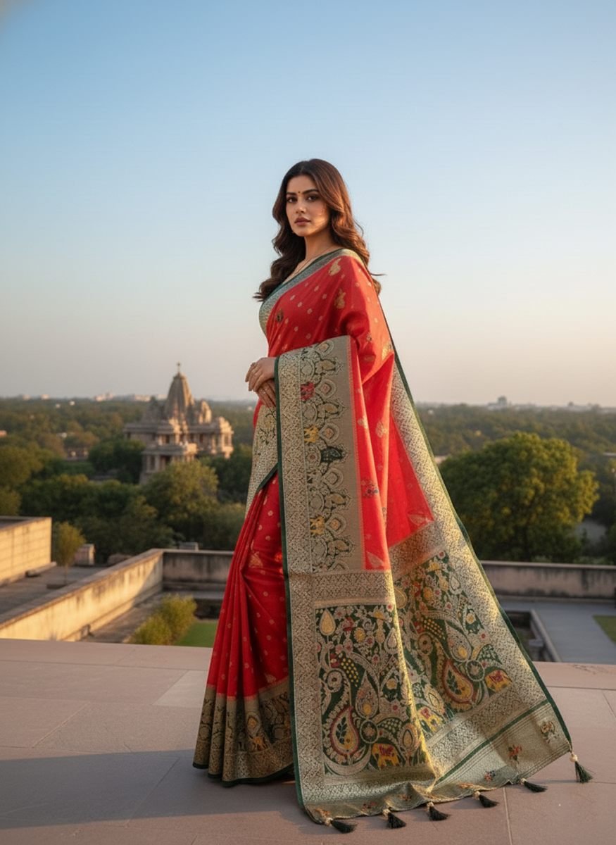 Key Features Fabric: Premium quality satin silk with a smooth, lustrous texture Type: Traditional Banarasi saree Work: Intricate woven zari detailing Look & Feel: Rich, elegant, and graceful drape Occasion: Perfect for weddings, festivals, parties, and traditional events Style: Classic ethnic design with a luxurious finish Blouse: Comes with a matching blouse pieceĀ Elevate your ethnic wardrobe with this luxurious Banarasi Satin Silk Saree, crafted to perfection with rich zari weaving. The smooth satin silk fabric offers a soft, glossy finish and graceful drape, while the intricate Banarasi weave reflects timeless Indian craftsmanship. Ideal for weddings, festive celebrations, and special occasions, this saree blends royal elegance with modern sophistication, making it a must-have for every saree lover.