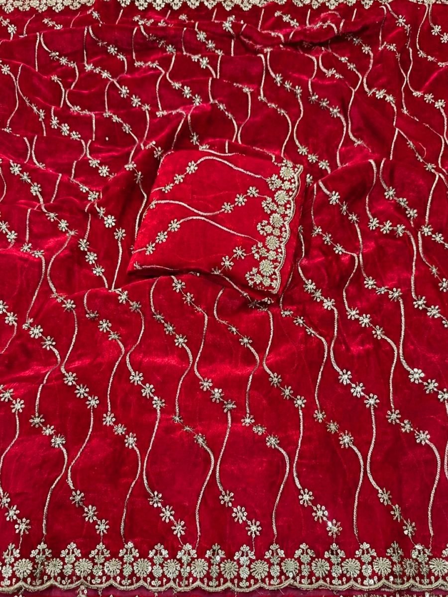 Fabric: Premium Chiffon Satin (lightweight, opaque, with a high-gloss finish). Work Type: All-over Zari and Sequin embroidery in a wavy vine pattern. Border Style: Designer scalloped cutwork border with heavy floral detailing. Blouse: Includes a matching chiffon satin blouse piece with embroidered borders for sleeves/back. Occasion: Wedding, Reception, Sangeet, Karwa Chauth, and Festive Parties. Feel: Soft, flowy, and comfortable for long-duration wear. Product Description The Fabric Experience: Crafted from high-quality chiffon satin, this saree offers the best of both worlds: the lightweight, effortless flow of chiffon and the lustrous sheen of satin. The Design & Workmanship: The body of the saree is embellished with continuous vertical wavy vines (Bel) embroidered in sparkling Zari and sequins. The Signature Border: The showstopper of this drape is its heavy scalloped cutwork border. Unlike traditional straight borders, this trendy scalloped edge features dense floral embroidery with precision cutwork, making it look like a piece of jewelry for your feet. The Blouse: It comes with a matching unstitched chiffon satin blouse piece featuring coordinated embroidery work, allowing you to style the sleeves or back with the same rich detailing as the saree border.