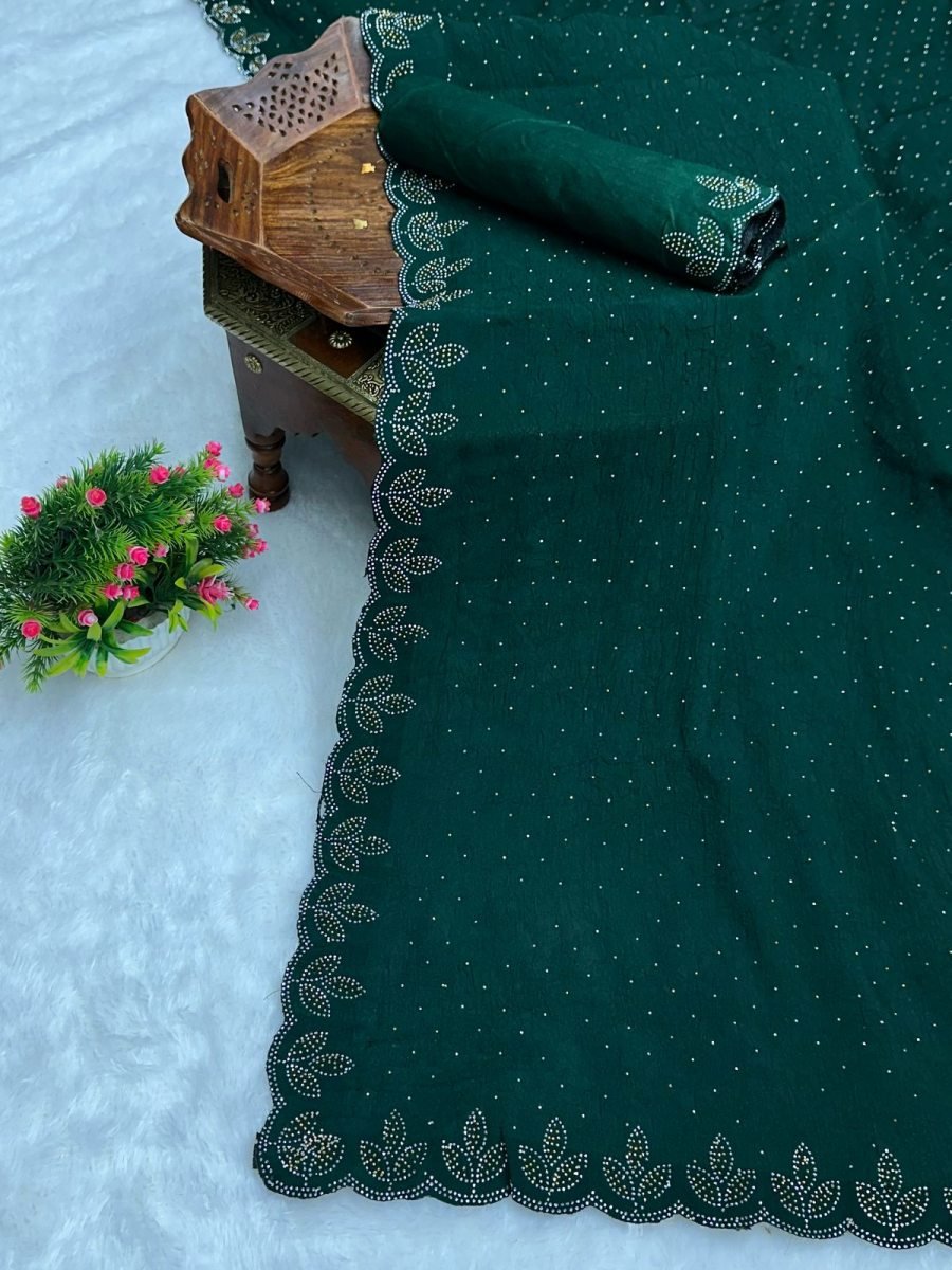Chinon Crush Silk fabric. Designed in a rich solid tone, it features all-over Siroski diamond work that adds a sparkling effect to every movement. The scalloped border is enhanced with delicate floral motifs in shimmering detail, capturing the essence of Bollywood-inspired traditional style.