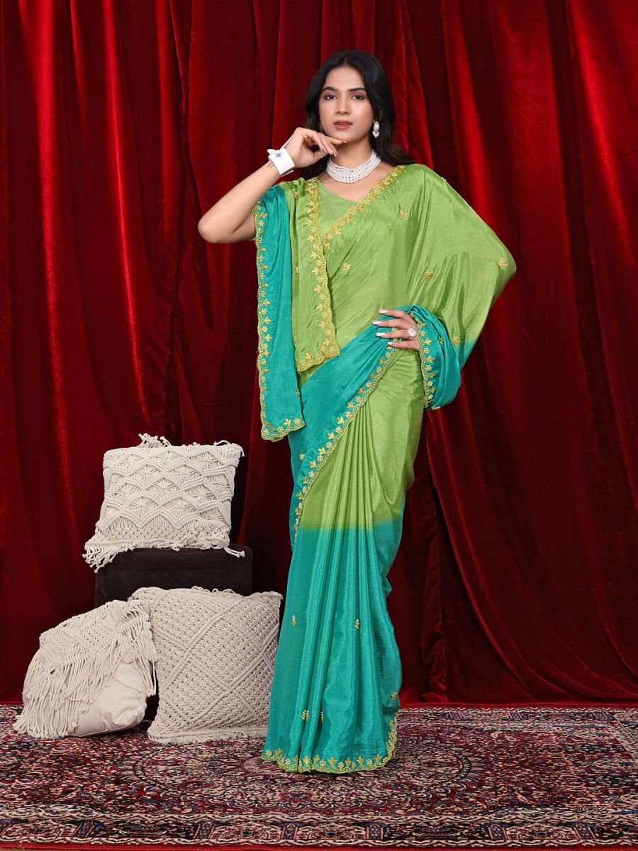 Fabric (Saree): Chinon Design: Dual Tone Shades with Embroidered Moti Border Saree Length: 5.5 Meters Blouse Piece: 0.8 Meter (Unstitched) Style: Traditional / Party Wear / Festive Wear Occasion: Wedding | Reception | Party | Festival | Ethnic Celebration Care Instructions: Dry Clean Recommended Drape yourself in timeless elegance with our Chinon Dual Tone Saree, crafted to perfection for women who love a blend of tradition and trend. The saree comes in graceful dual-tone shades that create a stunning flow of colors with every drape, making it an ideal pick for festive occasions, parties, and weddings.