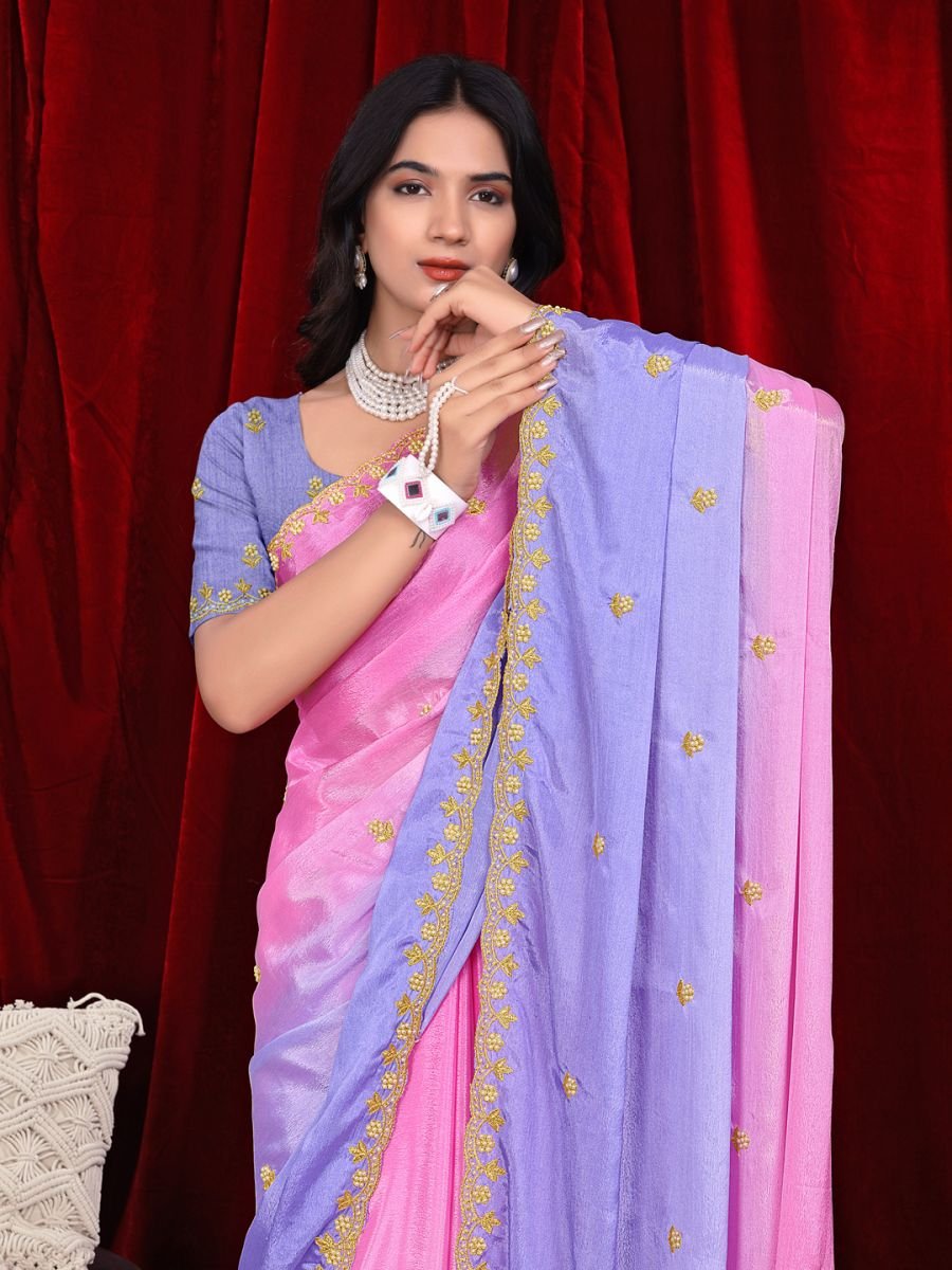 Chinon Dual Tone Saree with Embroidered Moti Border Unstitched Blouse Piece