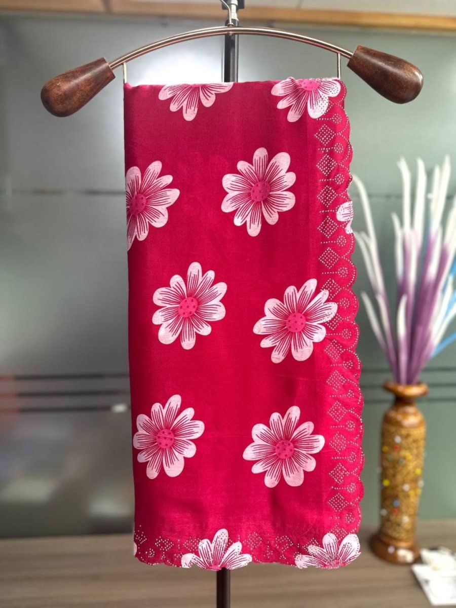 Product Details: Fabric: Chinon Work: All-over floral print with Swarovski diamond border Saree Length: 5.5 meters Blouse Length: 0.8 meters (Unstitched, printed design) Style: Festive / Party wear saree Occasion: Wedding, Party, Festival, Reception Description: Drape yourself in timeless elegance with this Chinon floral printed saree, beautifully designed for festive and party occasions. The saree features delicate all-over floral prints on soft Chinon fabric, paired with a sparkling Swarovski diamond work border that adds a luxurious touch. It comes with a matching 0.8-meter printed blouse piece, making it a complete ensemble. Perfect for weddings, receptions, festivals, and evening parties, this saree blends modern glam with classic charm.
