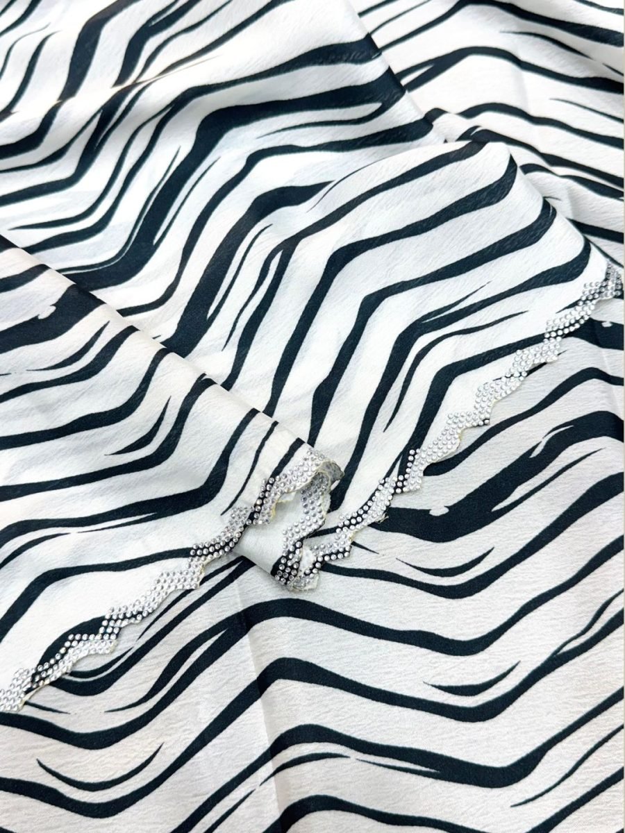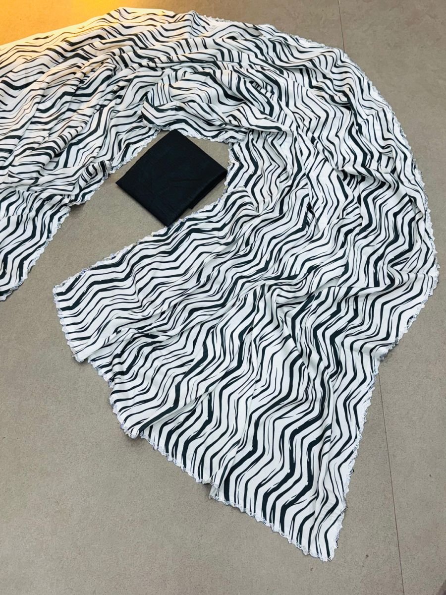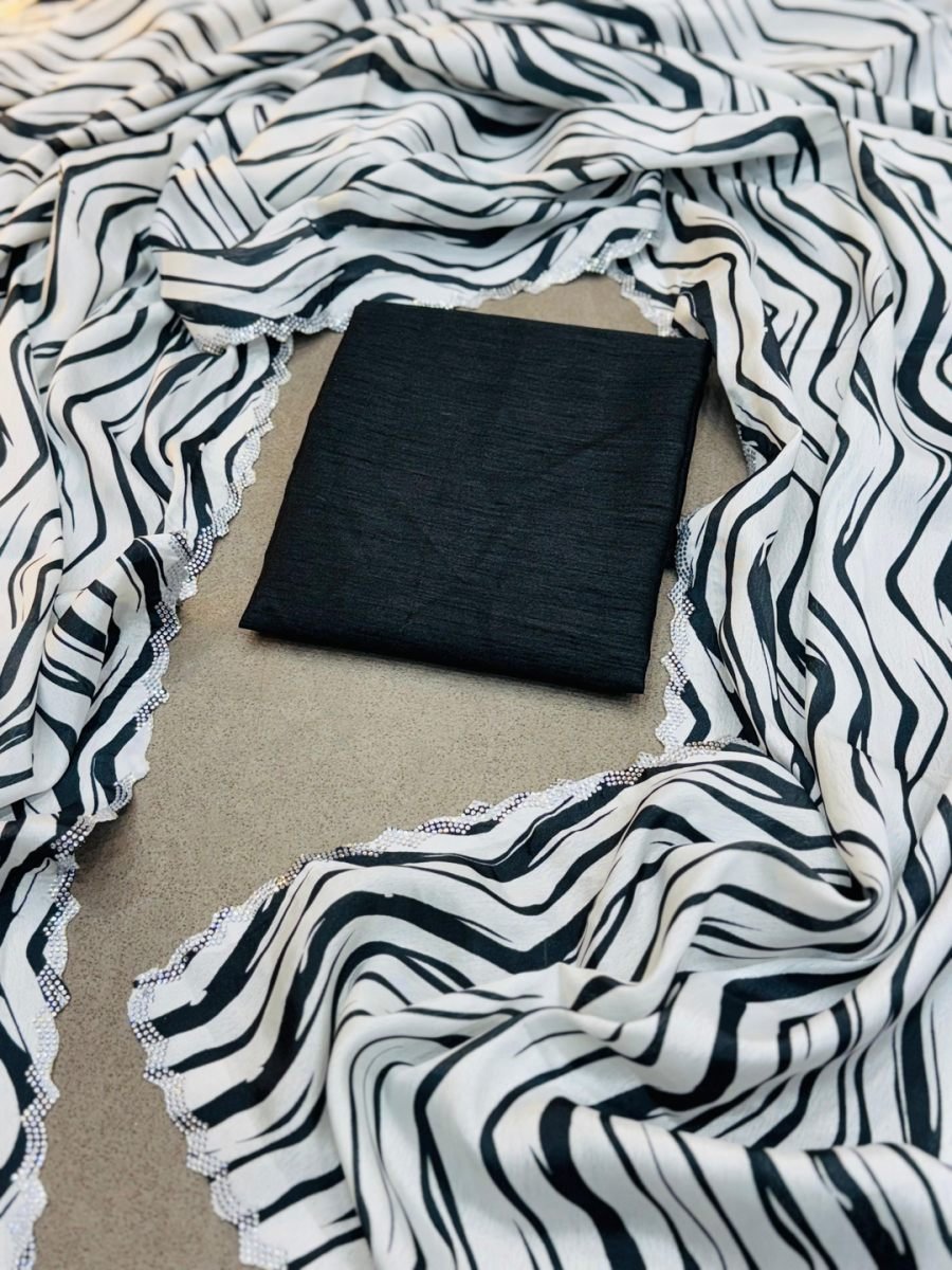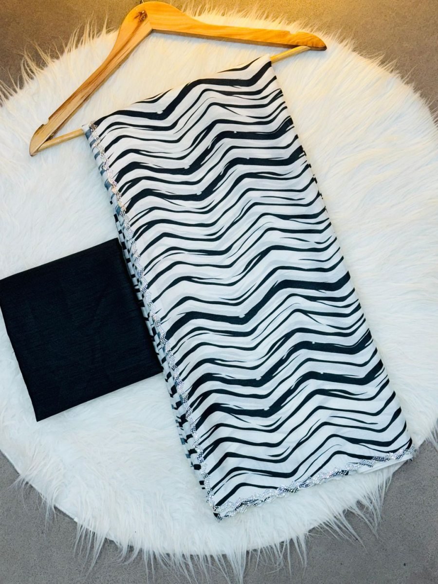 Saree Fabric: Premium Chinon Silk Saree Color: Black and White Saree Work: All-over digital chevron/zigzag print with a finely detailed Swarovski stone work border. Saree Length: Approximately 5.5 meters Blouse Fabric: Art Silk Blouse Color: Black Blouse Piece: 0.80 meters (Unstitched) Pattern: Graphic Print, Chevron, Zigzag Occasion: Party Wear, Cocktail Events, Festive Gatherings, Evening Wear Wash Care: Dry Clean Only to maintain the fabric's sheen and stonework. Package Contains: 1 Saree with 1 Unstitched Blouse Piece. Disclaimer: The actual product color may vary slightly from the images shown due to differences in photographic lighting sources or your monitor settings. Crafted from premium Chinon Silk, the fabric drapes like a dream, offering a lightweight feel and a subtle, lustrous sheen that moves with you. The fluid, flowy texture ensures you stay comfortable while looking effortlessly chic.
