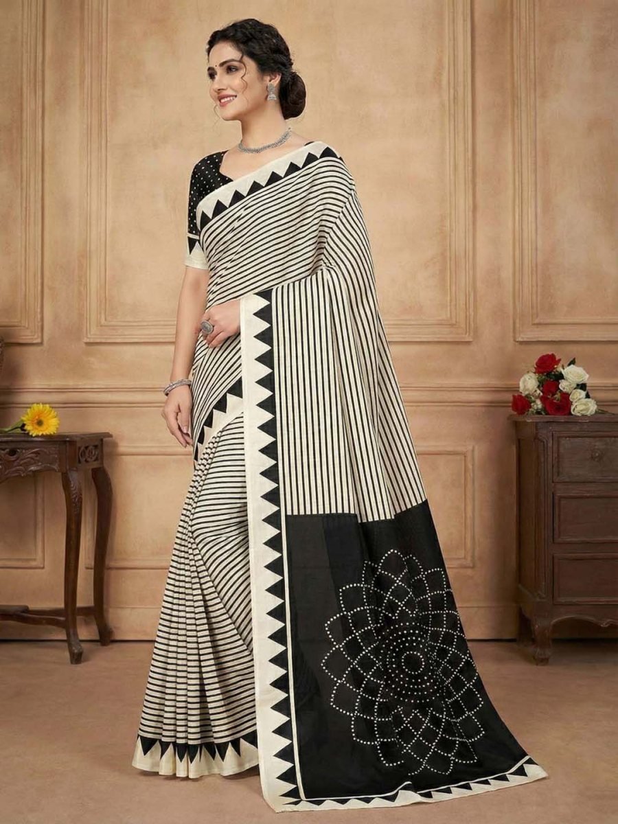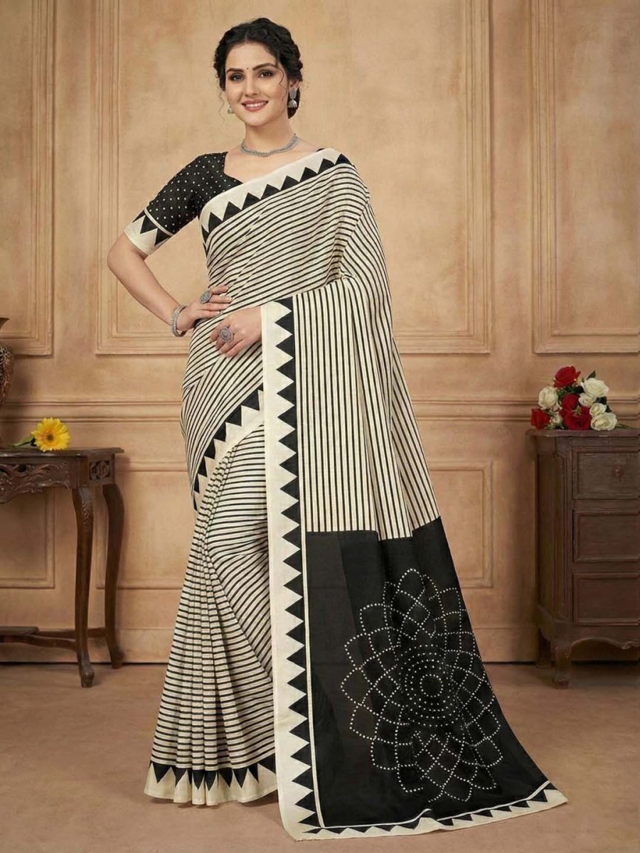 Luxurious Fabric: Made from high-quality Crepe Silk that offers a smooth texture, slight sheen, and effortless flow. Fusion Design: A unique combination of modern vertical stripes on the pleats and a traditional Bandhani-inspired print on the pallu. Statement Border: Features a distinct geometric "temple" (sawtooth) border that runs along the edges, defining the saree's shape. Lightweight ; Comfortable: The breathable nature of the fabric makes it ideal for all-day wear in any season. Matching Blouse: Comes with an unstitched blouse piece featuring a coordinating dotted print and matching border for the sleeves. Elevate your everyday style with this exquisite crepe silk saree, designed for the modern woman who loves a fusion of tradition and trend. This saree features a striking "half-and-half" concept: the body showcases bold, elongating geometric stripes for a chic, contemporary look, while the pallu displays a magnificent, large-scale Bandhani-style mandala motif that adds a touch of ethnic grandeur.