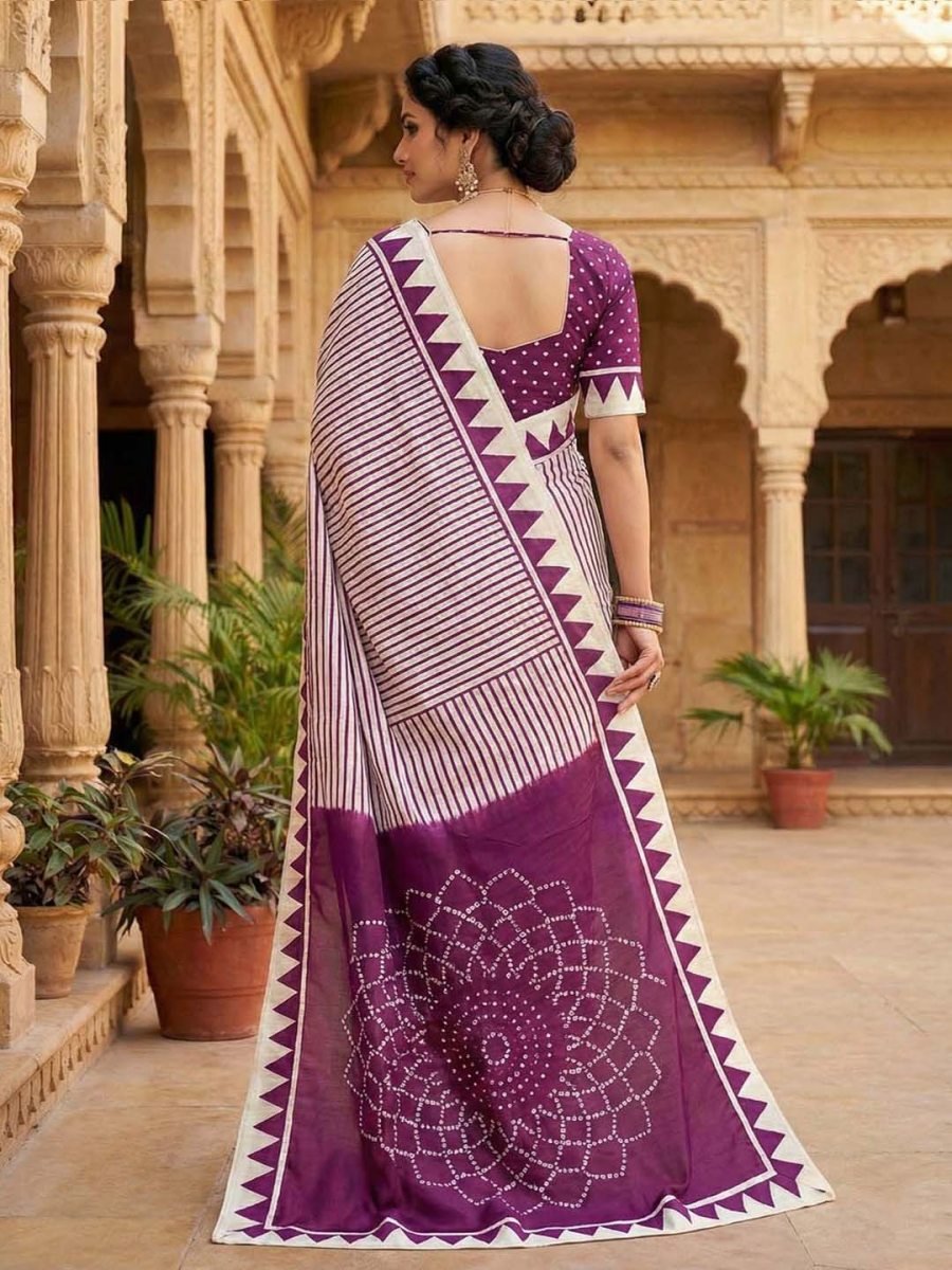 Luxurious Fabric: Made from high-quality Crepe Silk that offers a smooth texture, slight sheen, and effortless flow. Fusion Design: A unique combination of modern vertical stripes on the pleats and a traditional Bandhani-inspired print on the pallu. Statement Border: Features a distinct geometric "temple" (sawtooth) border that runs along the edges, defining the saree's shape. Lightweight ; Comfortable: The breathable nature of the fabric makes it ideal for all-day wear in any season. Matching Blouse: Comes with an unstitched blouse piece featuring a coordinating dotted print and matching border for the sleeves. Elevate your everyday style with this exquisite crepe silk saree, designed for the modern woman who loves a fusion of tradition and trend. This saree features a striking "half-and-half" concept: the body showcases bold, elongating geometric stripes for a chic, contemporary look, while the pallu displays a magnificent, large-scale Bandhani-style mandala motif that adds a touch of ethnic grandeur.